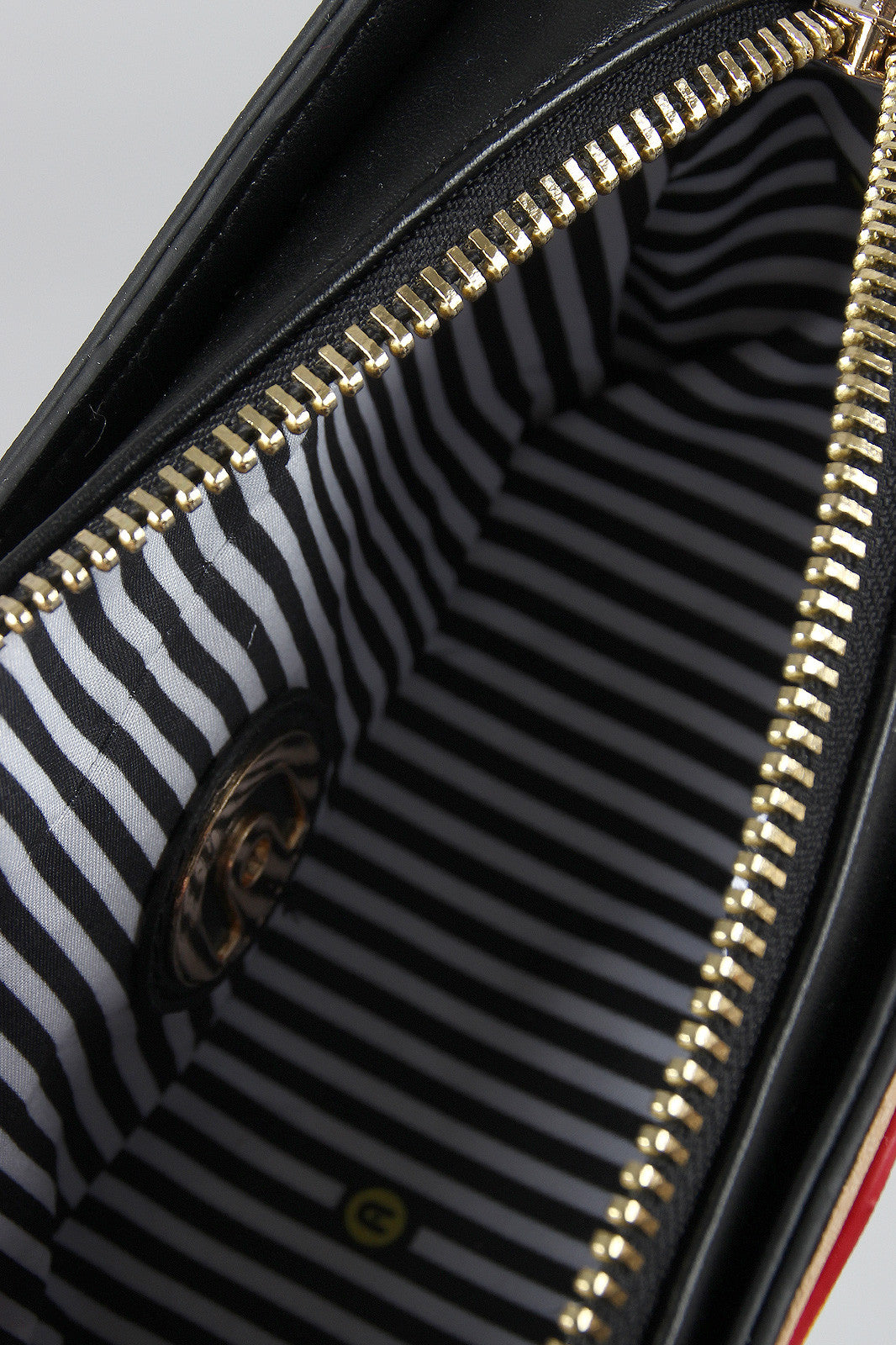 Attention all foodies! This whimsical bag features a delicious hot dog design in smooth leatherette, large gold-tone zipper closure, and threaded chain shoulder strap with a 23.5" drop.
