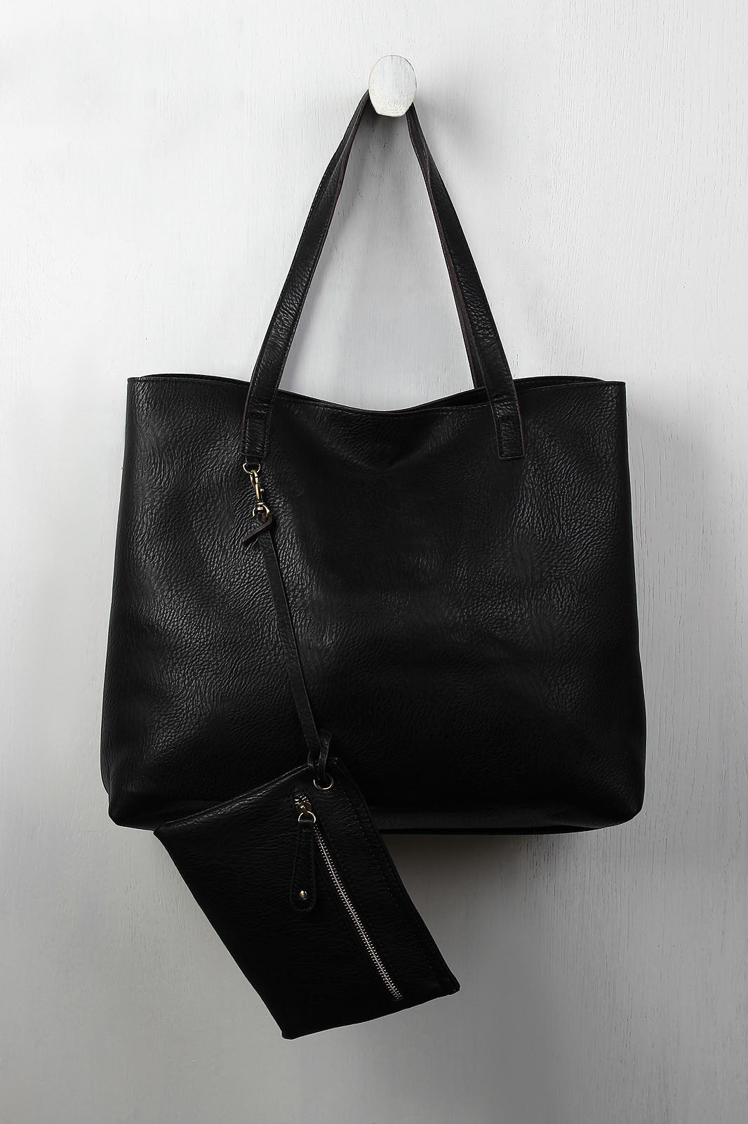 This large tote features one side with a faux suede front and vegan leather back, full vegan leather on the reverse, and flat top handles with 8.5" drop. Finished with magnetic closure and zippered pouch with detachable strap and snap hook.