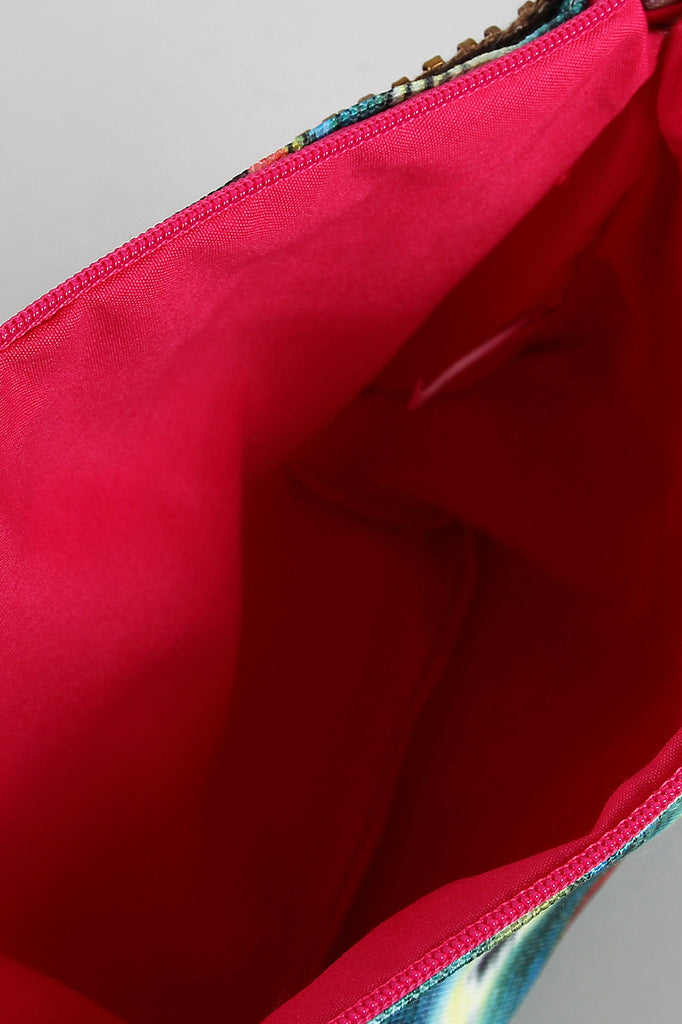 This brightly colored peacock feather pattern throughout, tribal ribbon trim with looped fringe, and a top zipper with a metallic-threaded tassel zipper pull.