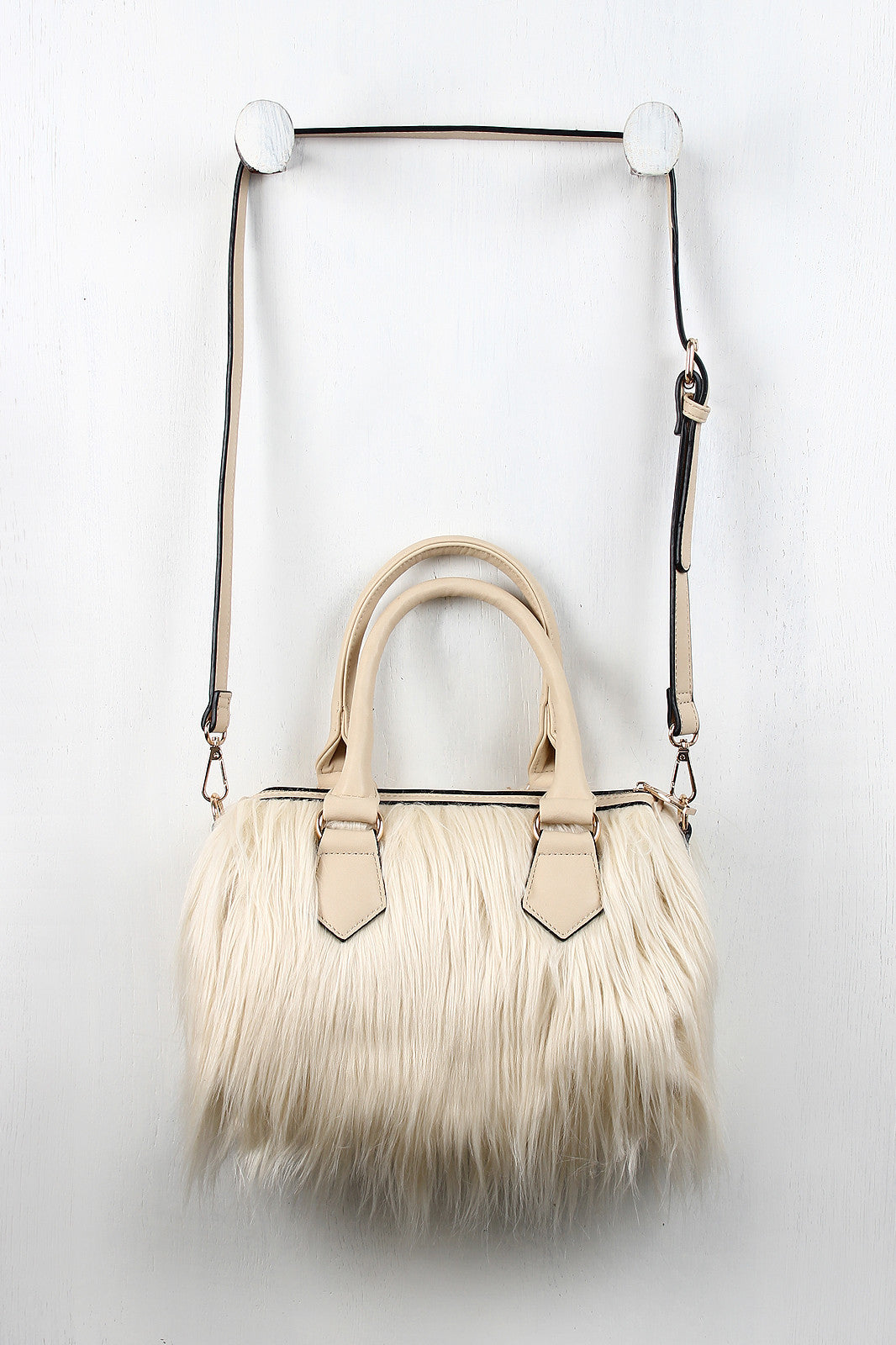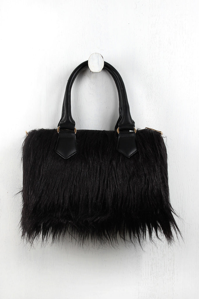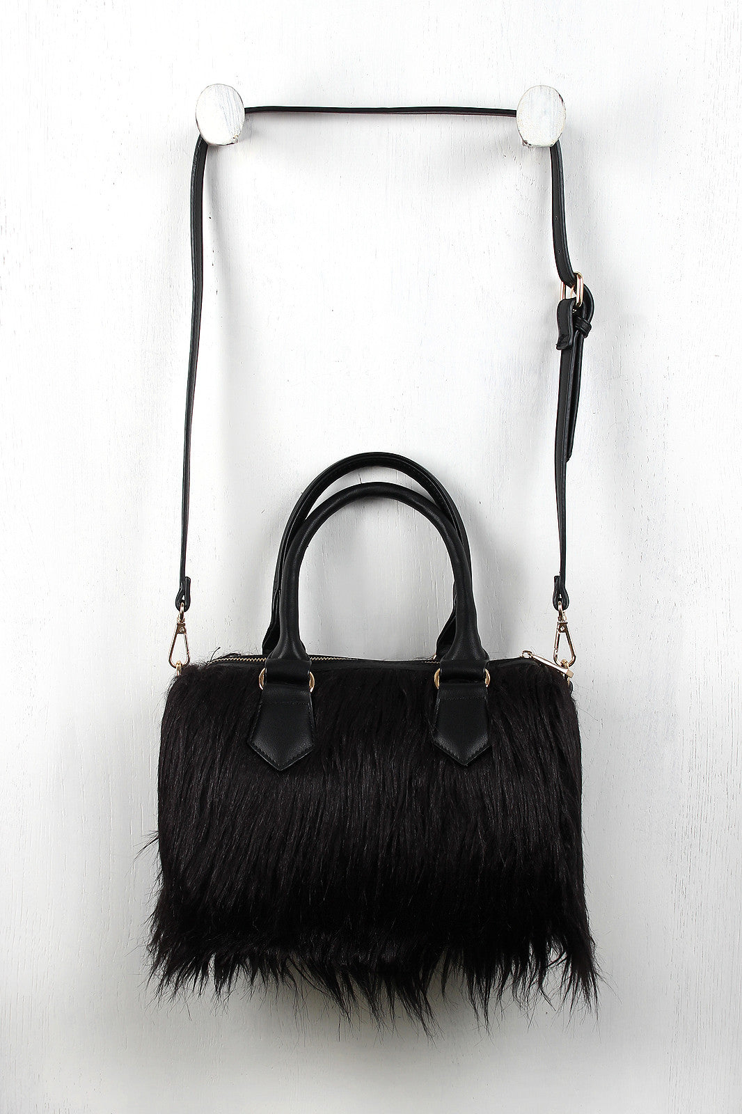 A satchel soft faux fur throughout, two round vegan leather handles with a 6.5" drop, and full-length metallic zipper top. The spacious interior is fully lined with two slip pockets and one zipper pocket. Bag includes four round purse feet at the bottom and an adjustable shoulder strap with glossy lobster hook attachment.