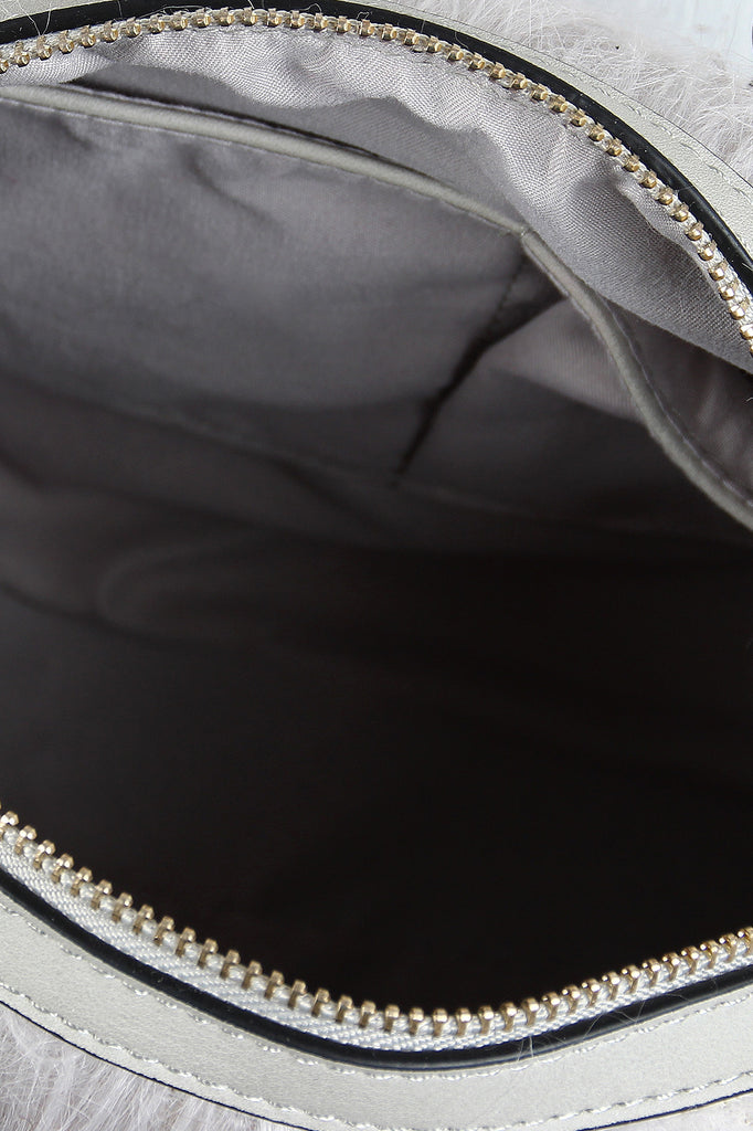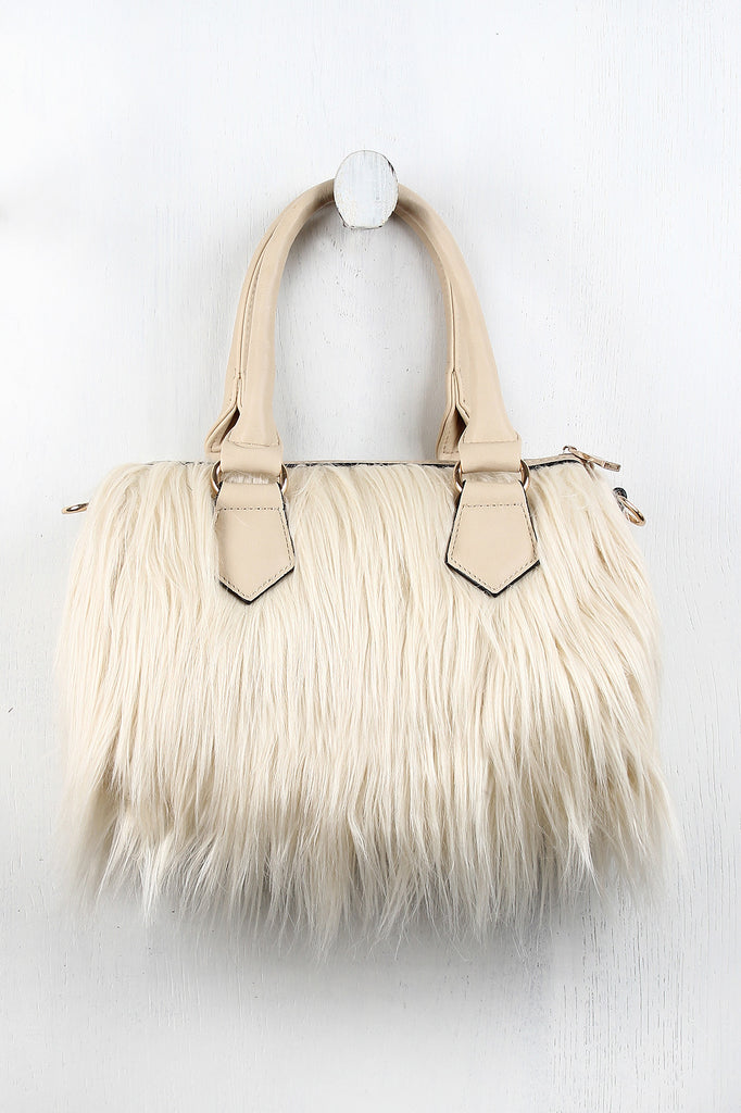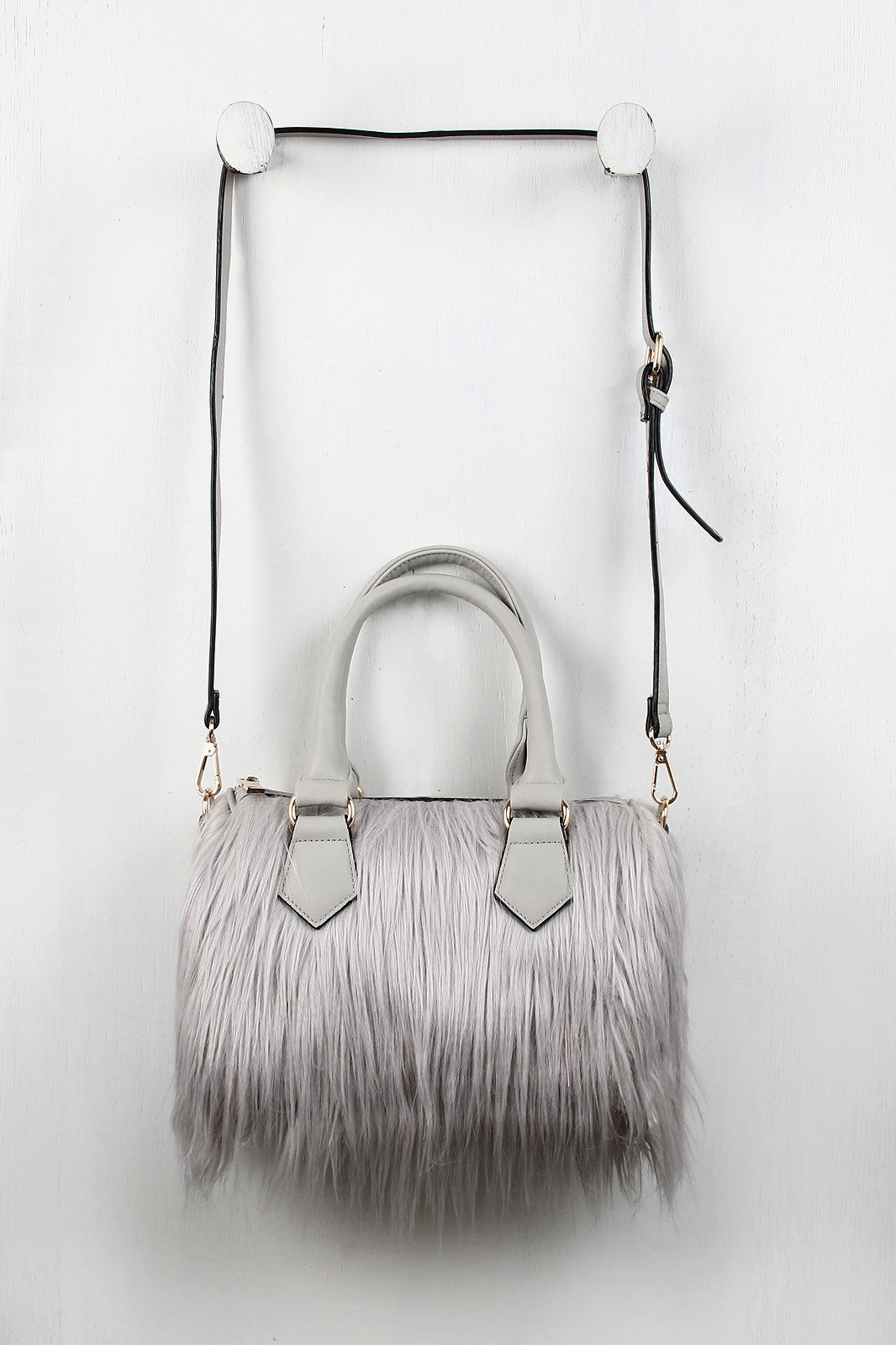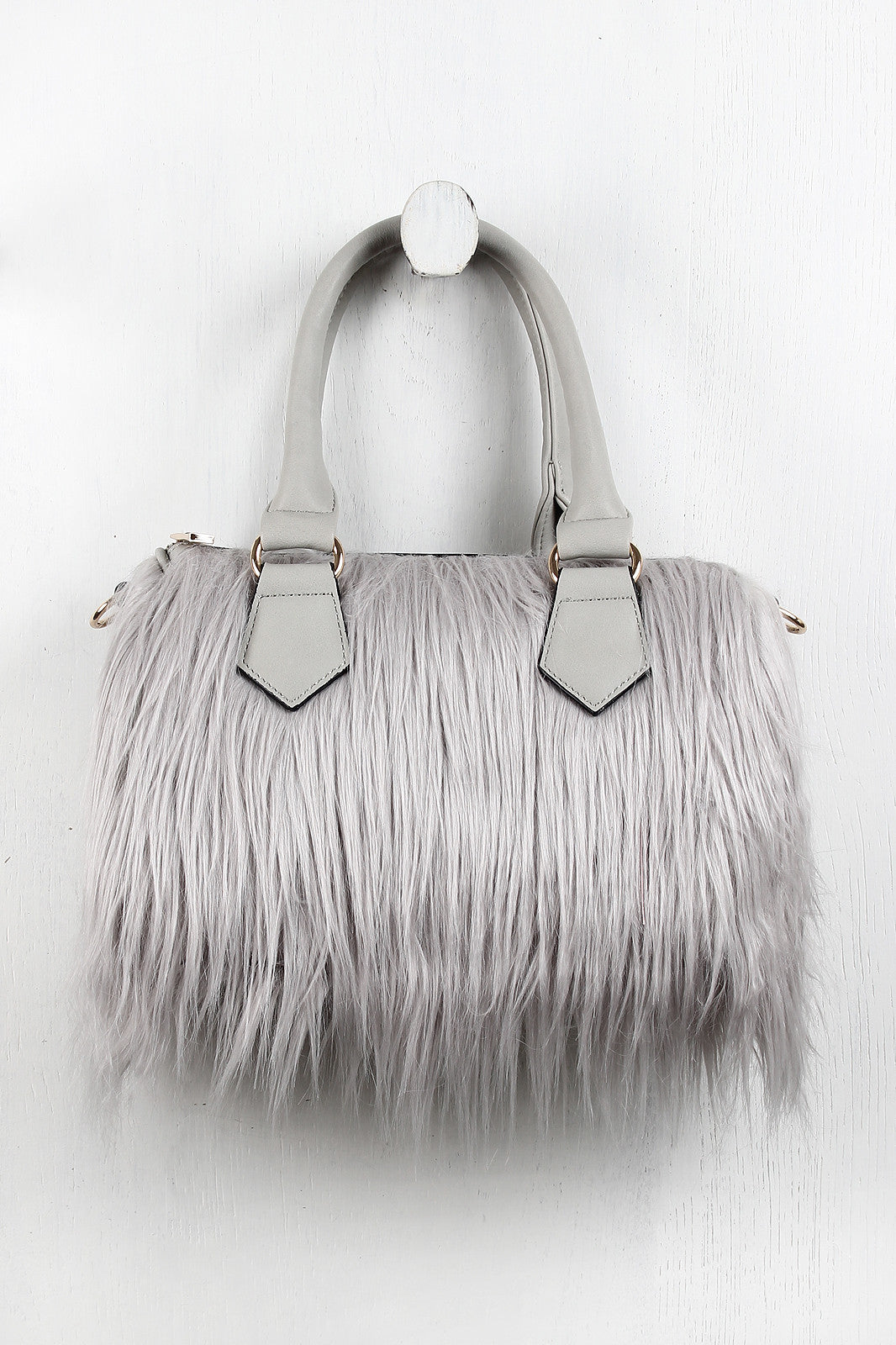 A satchel soft faux fur throughout, two round vegan leather handles with a 6.5" drop, and full-length metallic zipper top. The spacious interior is fully lined with two slip pockets and one zipper pocket. Bag includes four round purse feet at the bottom and an adjustable shoulder strap with glossy lobster hook attachment.