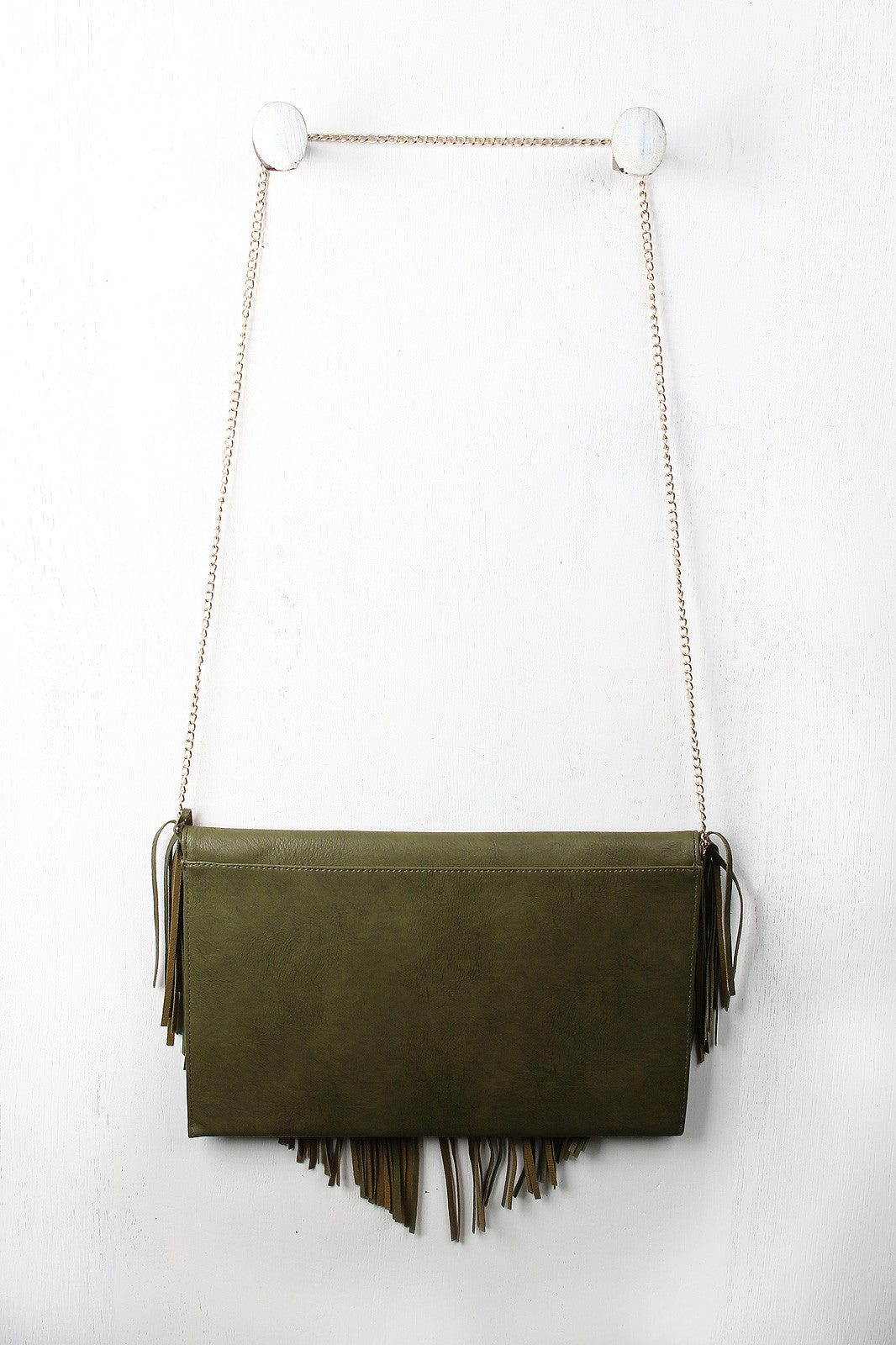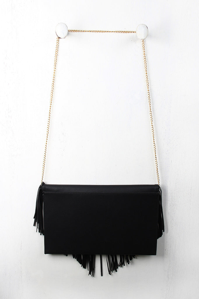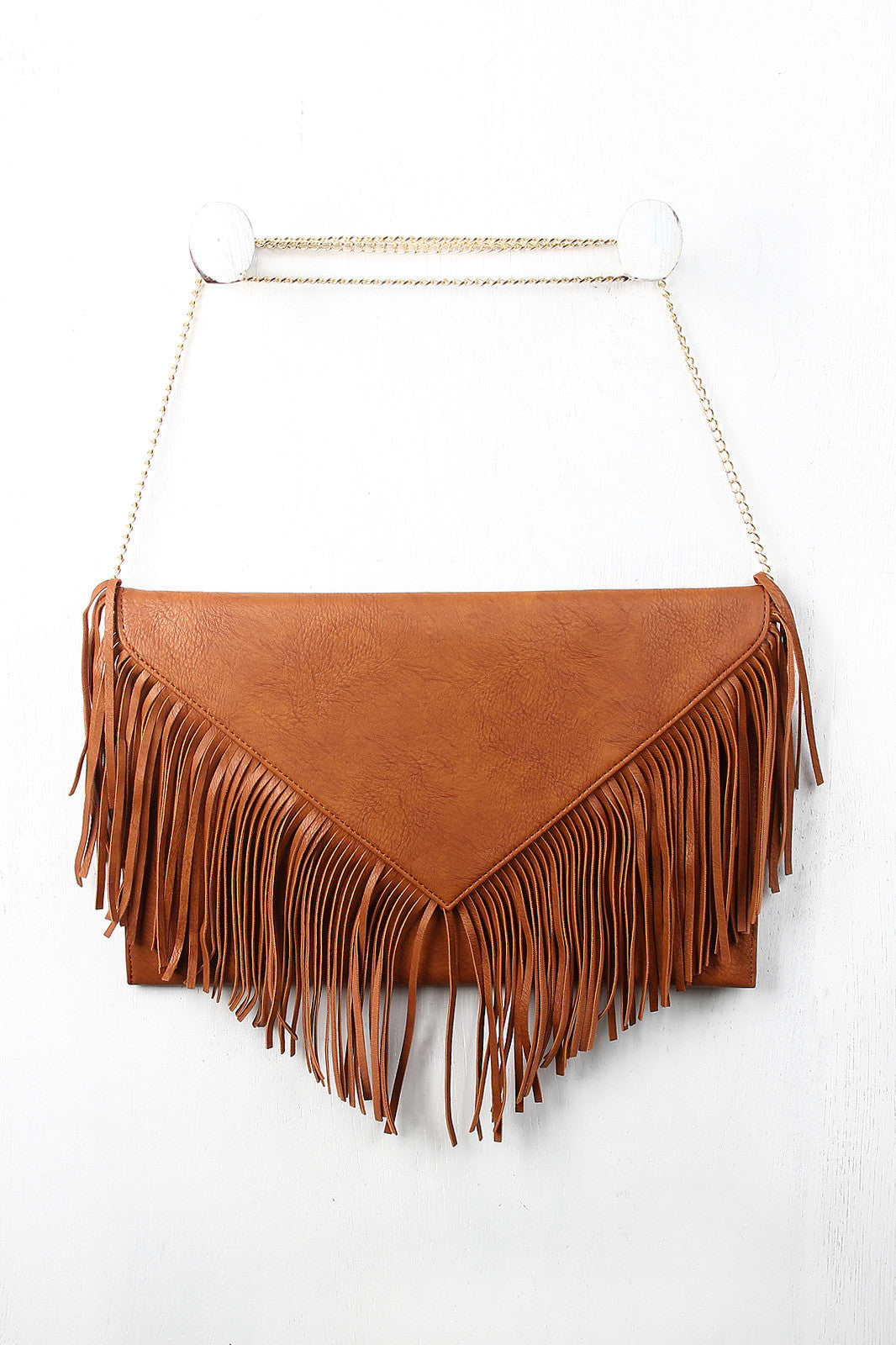 This vegan leather envelope bag features a v-shape pointed flap with fringe trim, magnetic button closure, and a zippered main compartment. Includes a detachable curb link chain shoulder strap with a 25" drop.