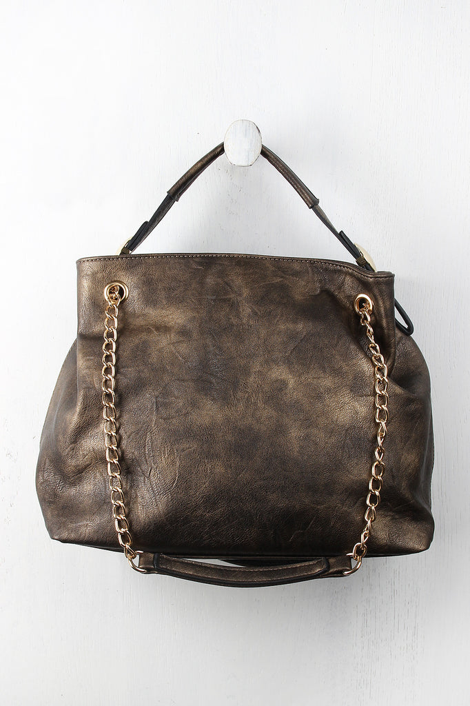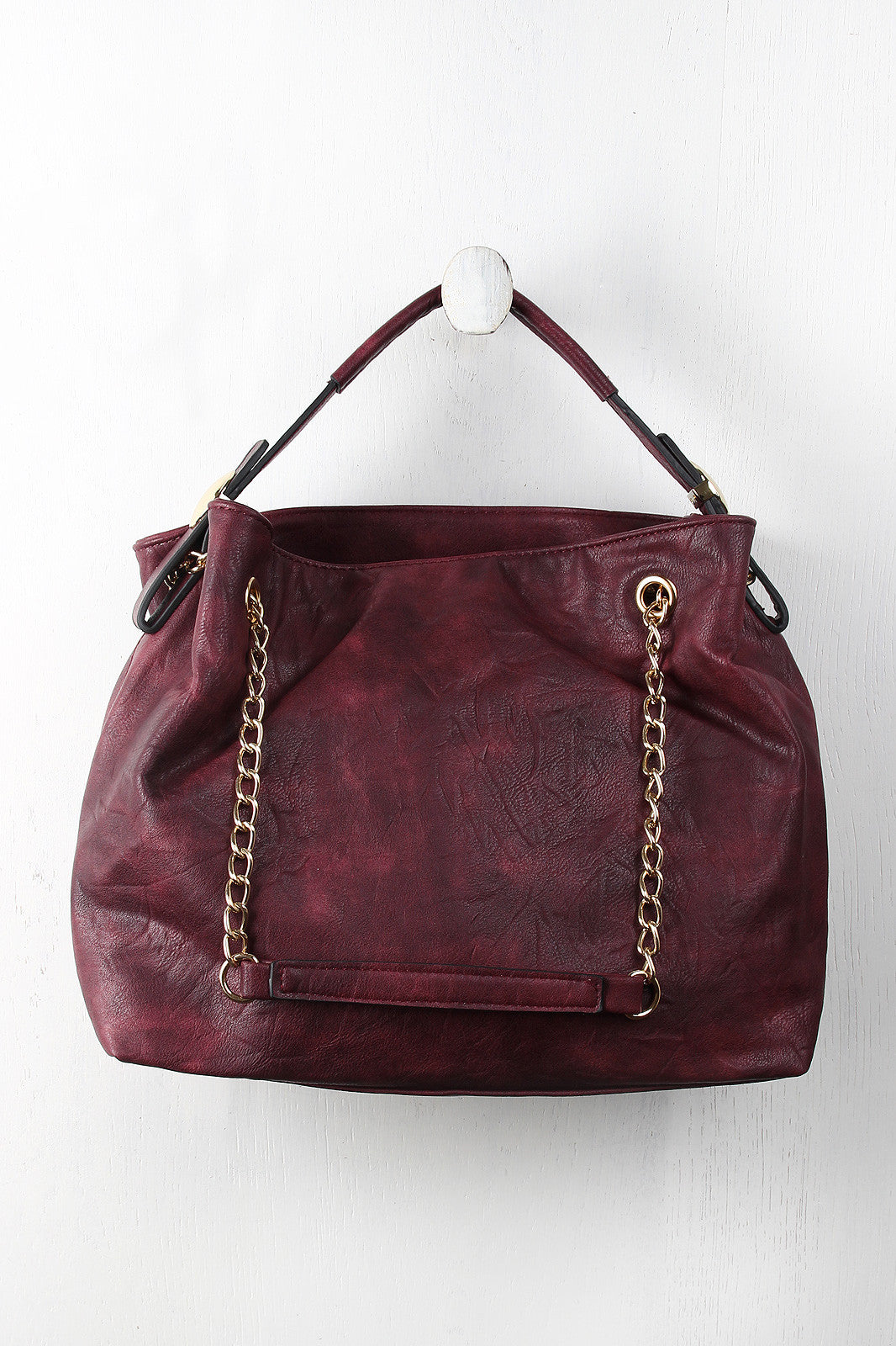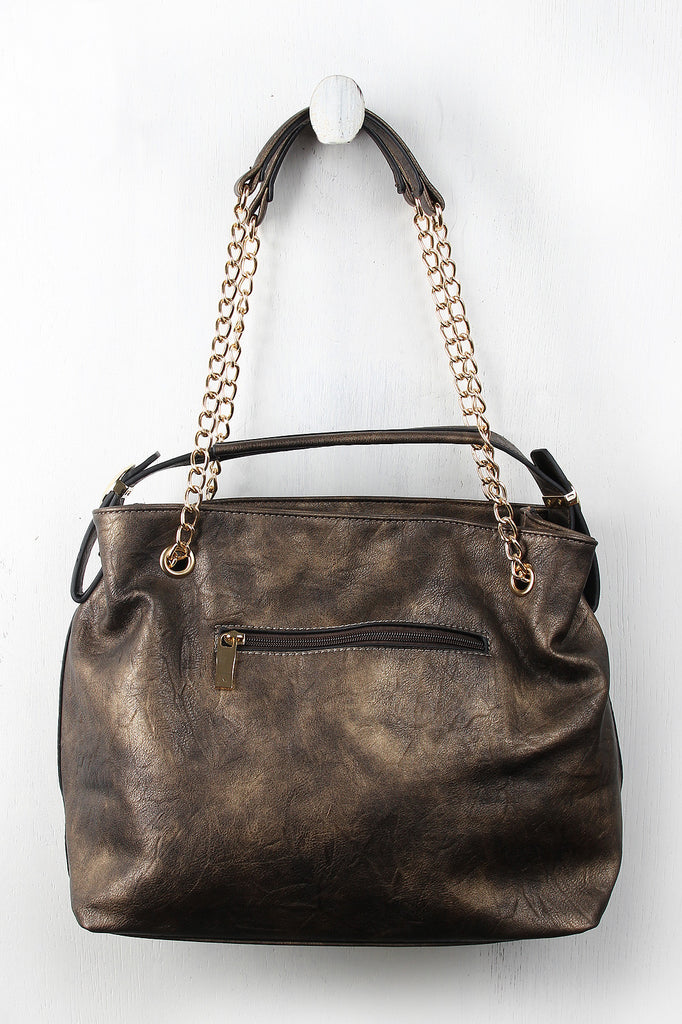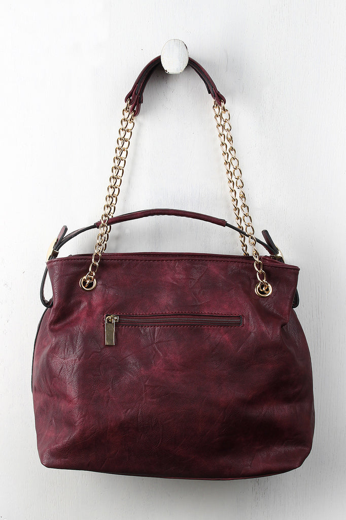 This distressed hobo bag features a top handle with a 4.5" drop and round metallic plate embellishments, sliding shoulder chains, and top zipper closure. The divided interior features two zipper pockets and two slip pockets. Finished with one exterior zipper pocket.