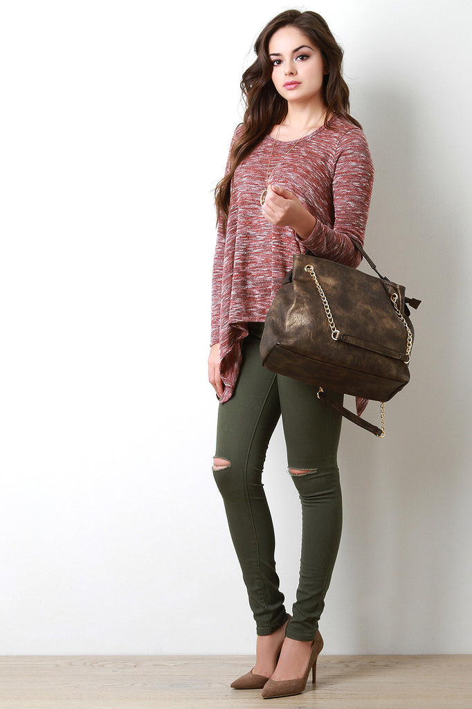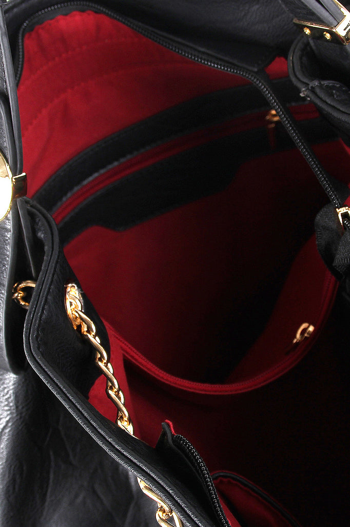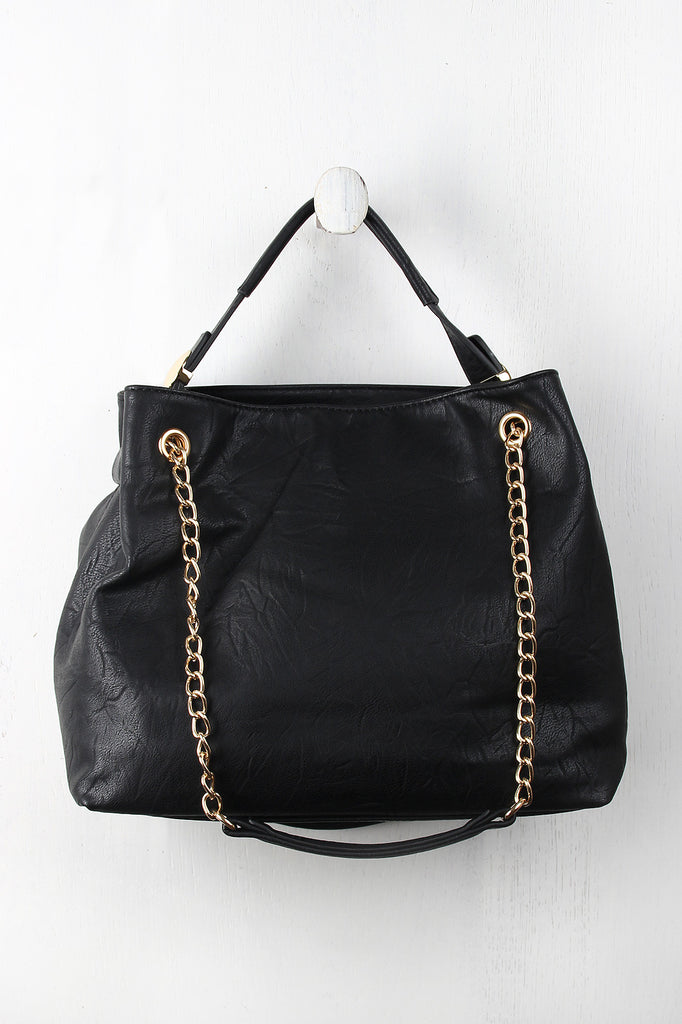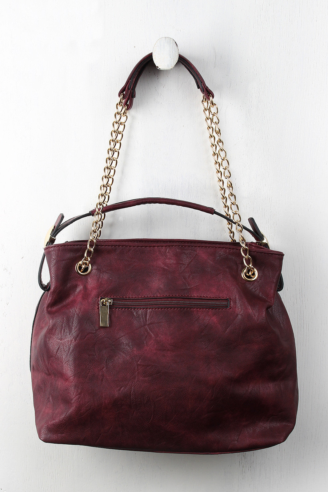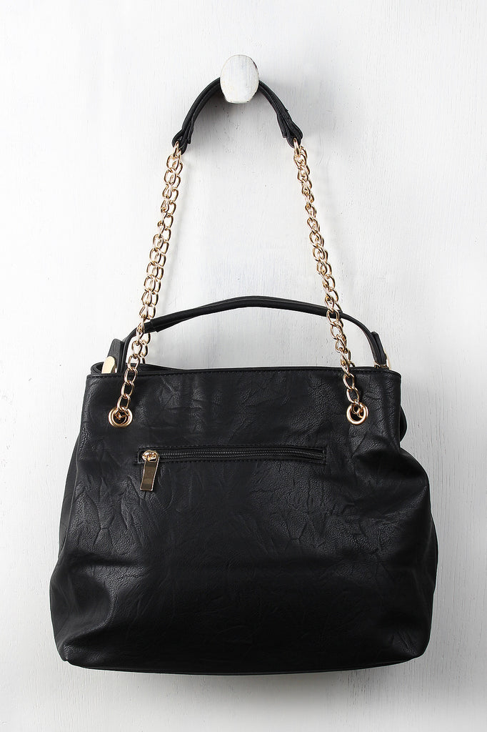 This distressed hobo bag features a top handle with a 4.5" drop and round metallic plate embellishments, sliding shoulder chains, and top zipper closure. The divided interior features two zipper pockets and two slip pockets. Finished with one exterior zipper pocket.