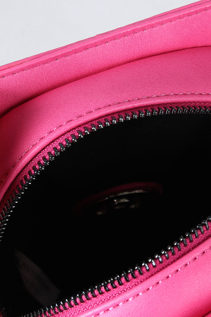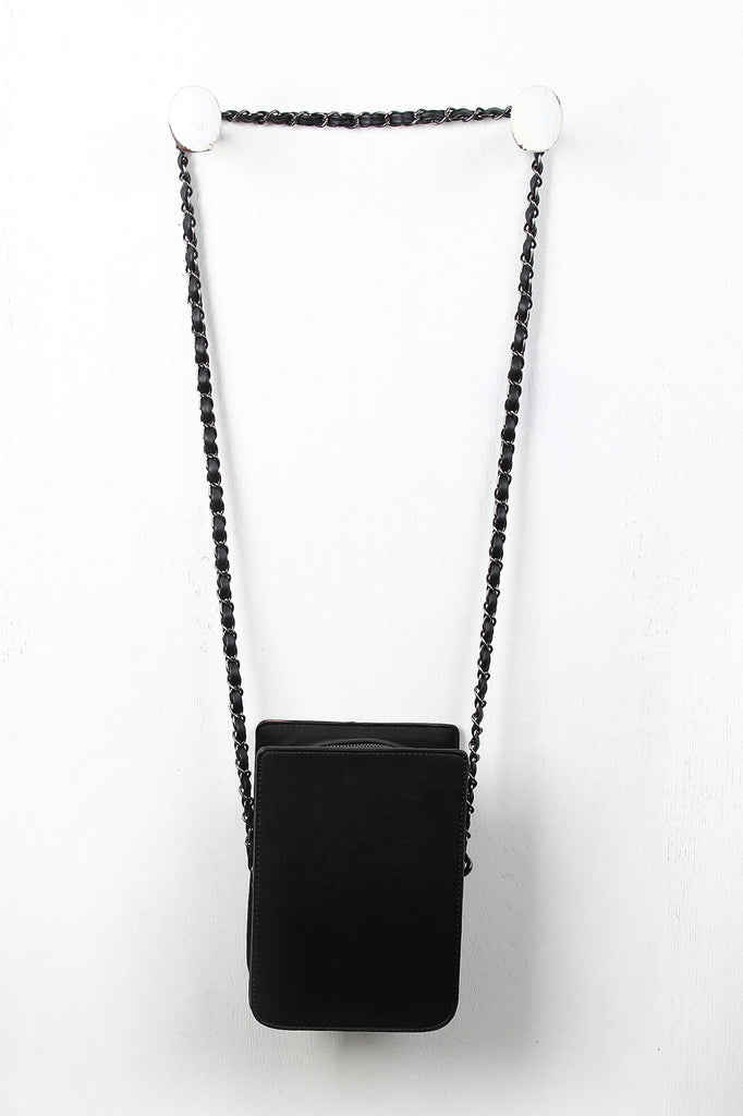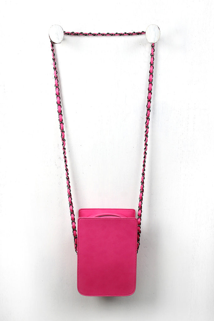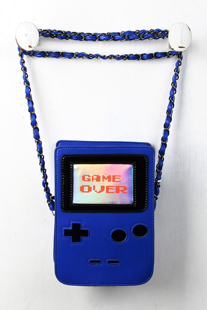Don't got game? Let this bag help you out. It features a retro gaming device design with vegan leather, an iridescent front panel, and indented glossy "buttons." Bag has a top zipper closure, interior lining with a single slip pocket, and a threaded shoulder chain with a 22" drop.