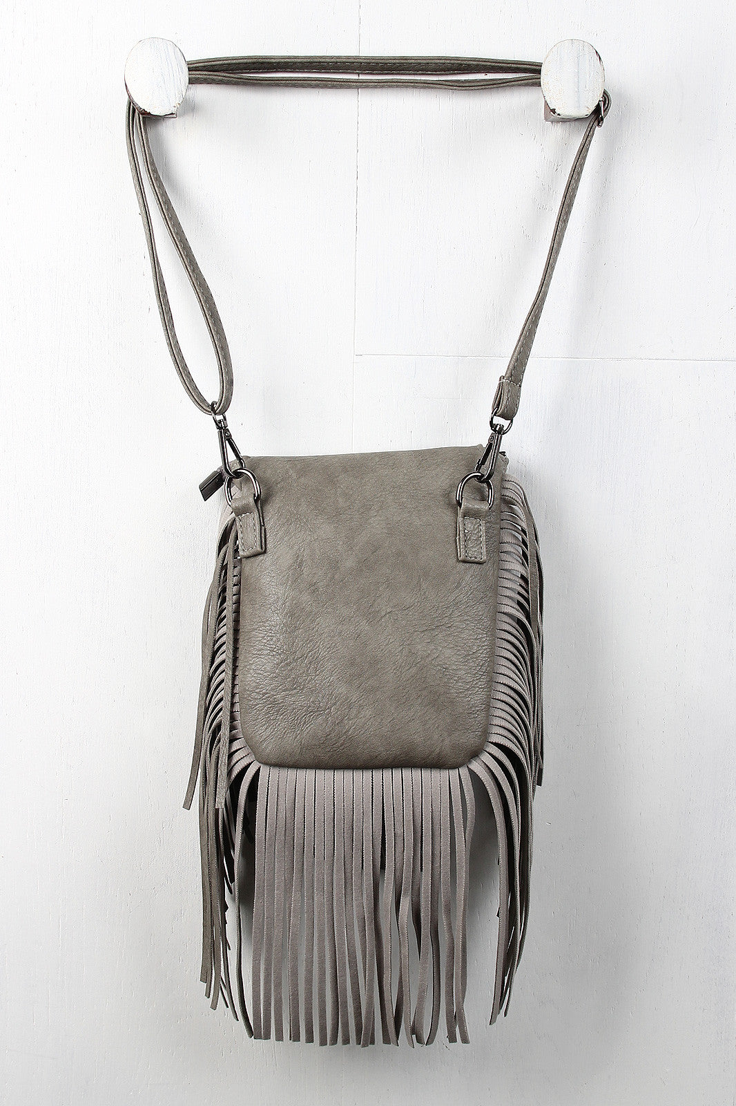 A vegan leather fringe trim. Also features satin interior lining and a magnet button and zipper closure. The adjustable shoulder strap attaches to the back of the bag with clips (12" drop).