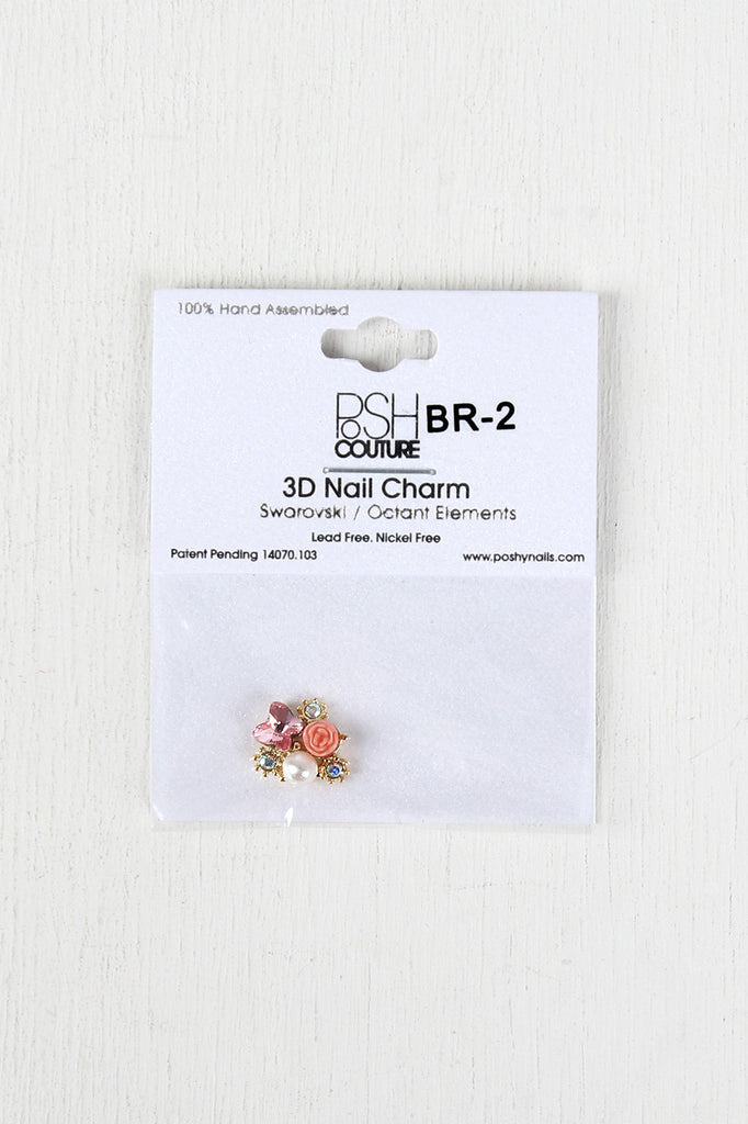 Nail charm featuring a resin rosebud, butterfly, and faux pearl along with smaller rhinestone accents. Charm is reusable, so mix and match for different looks!