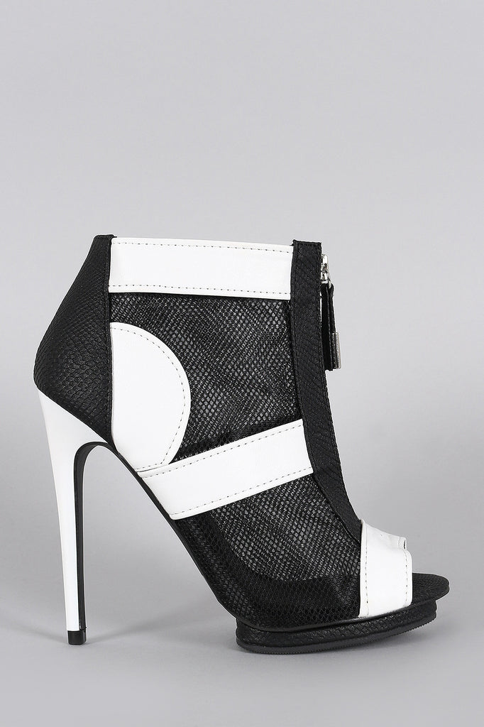This booties features a semi-sheer mesh with snake embossed vegan leather panels, peep toe silhouette, low architectural platform, and stiletto heel. Finished with cushioned insole and front zip-up closure for easy on/off.
