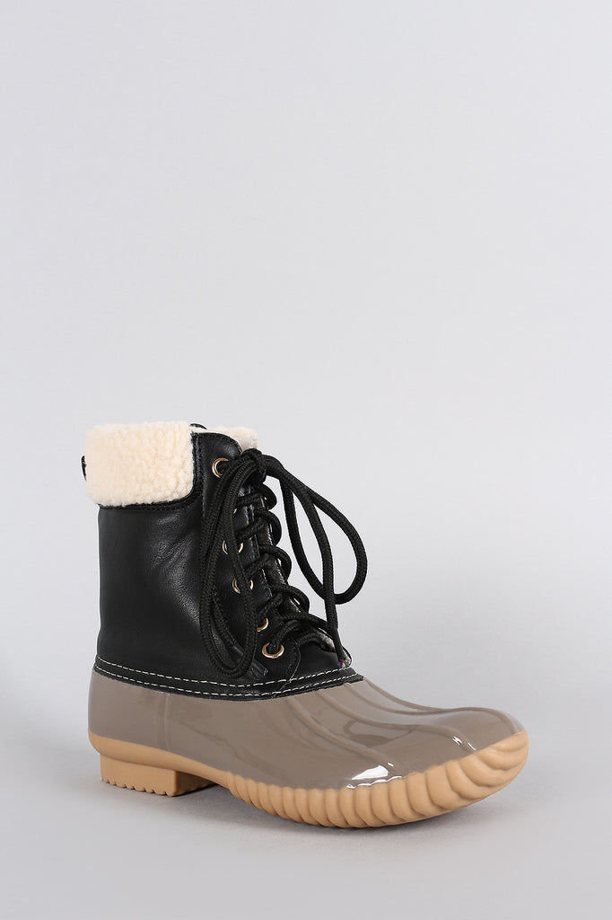 These duck ankle boots feature a combination of vegan leather/PVC upper with cozy faux shearling cuff design, round toe, top stitching accents, and low heel. Finished with cushioned insole, faux shearling interior lining, and lace up front closure.Material: Vegan Leather/PVC (man-made)Sole: Rubber