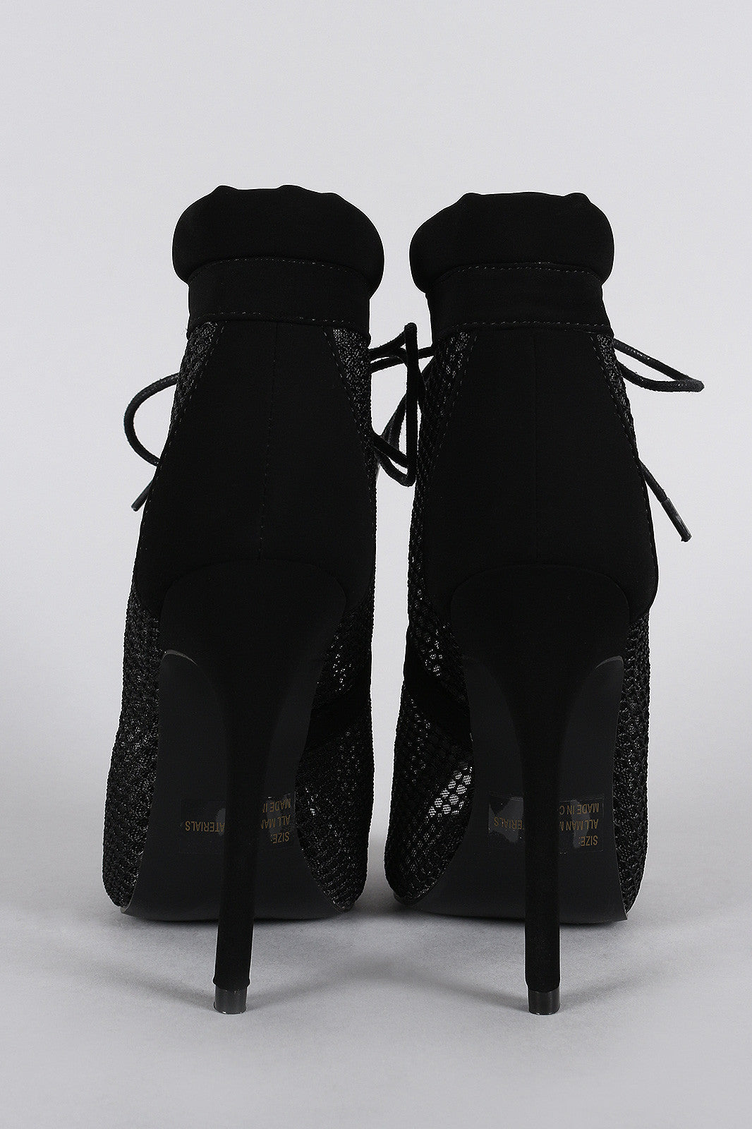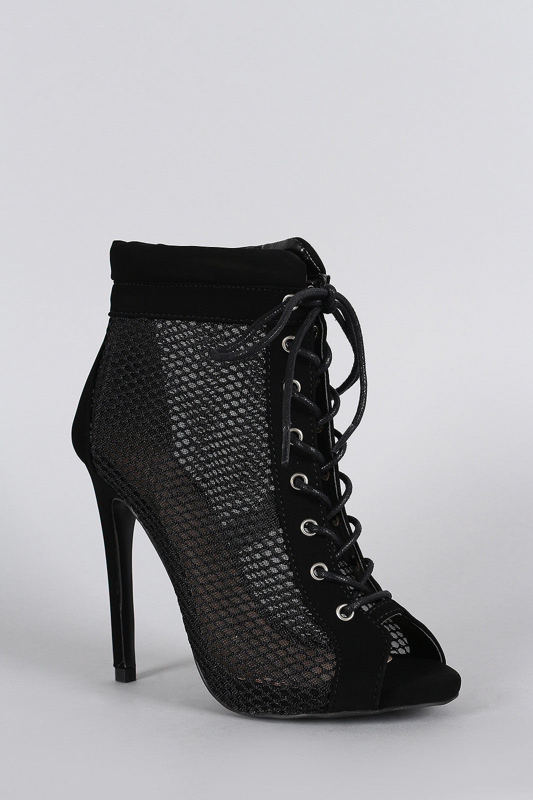 These lace up booties are mesh design, featuring peep toe openings and padded collars. Finished on leg-lengthening stiletto heels.