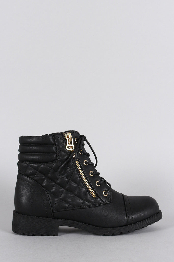 These ankle boots feature a round toe silhouette, quilted design with zipper trims, lace up front, and low block heel. Finished with cushioned insole, soft interior lining, and side zipper closure for easy on/off.Material: Vegan Leather (man-made)Sole: Treaded