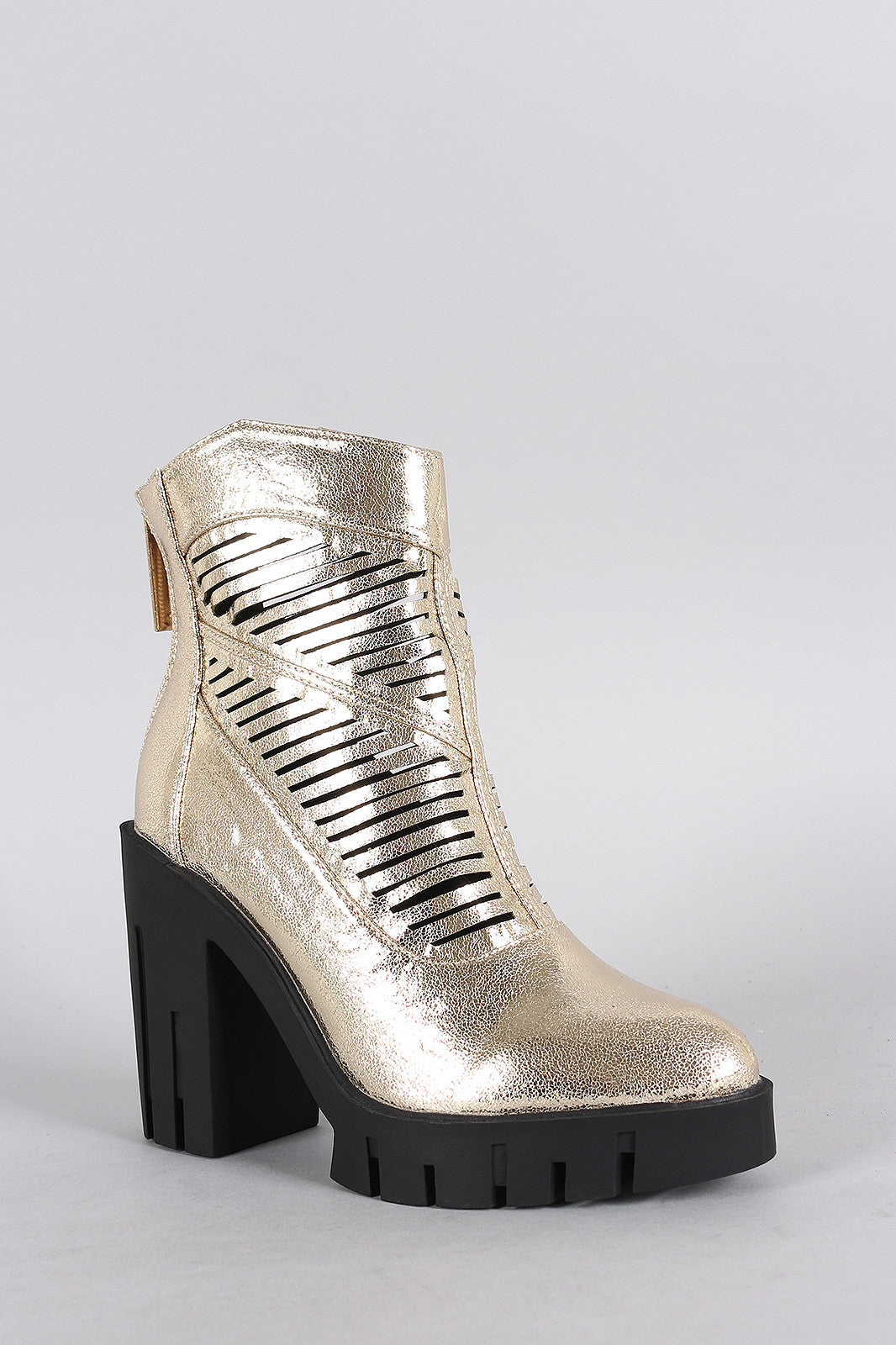 Metallic Western Slits Pointy Toe Lug Platform Chunky Heel Boots
