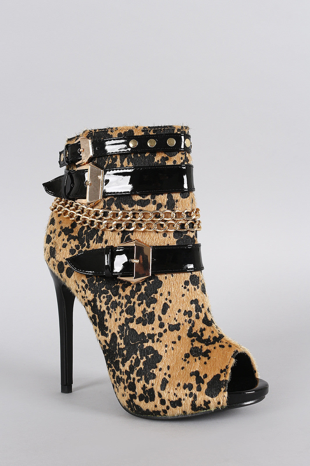 These striking leopard print calf hair with decorative chains and buckled straps detail. Also features a peep toe silhouette, low hidden platform, and stiletto heel. Finished with cushioned insole, soft interior lining, and side zipper closure for easy on/off.Material: Vegan Calf Hair (man-made)Sole: Synthetic