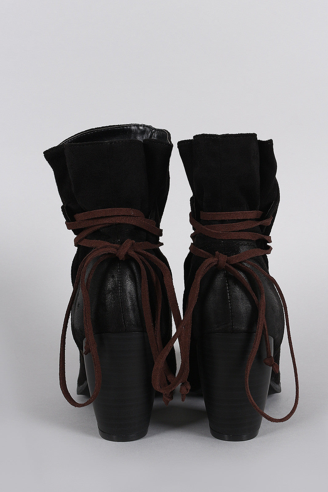 These trendy ankle boots feature a soft vegan suede fabrication, round toe silhouette, chunky stacked heel, cushioned insole, and self-tie lace closure.Material: Vegan Suede (man-made)Sole: Synthetic