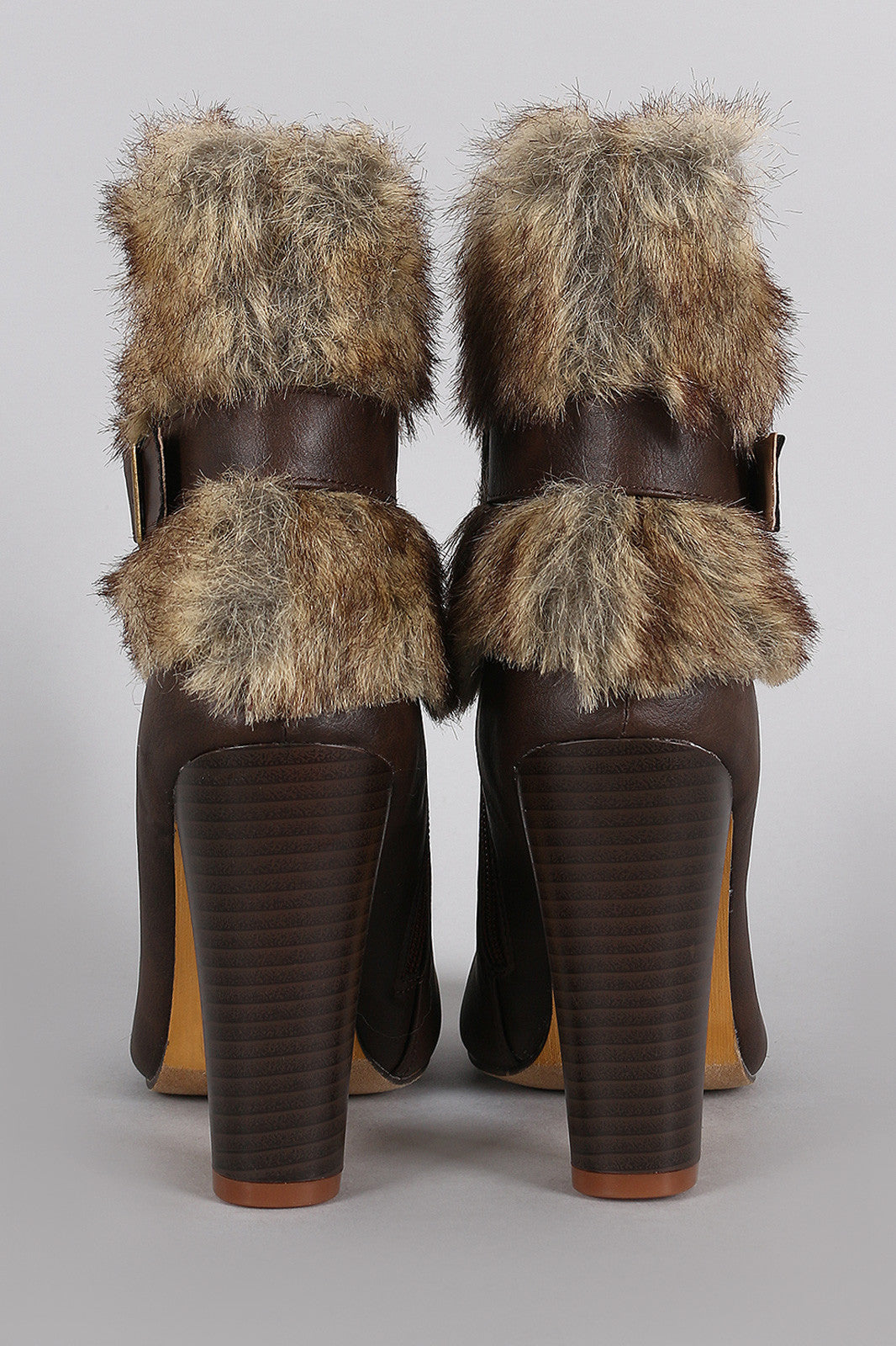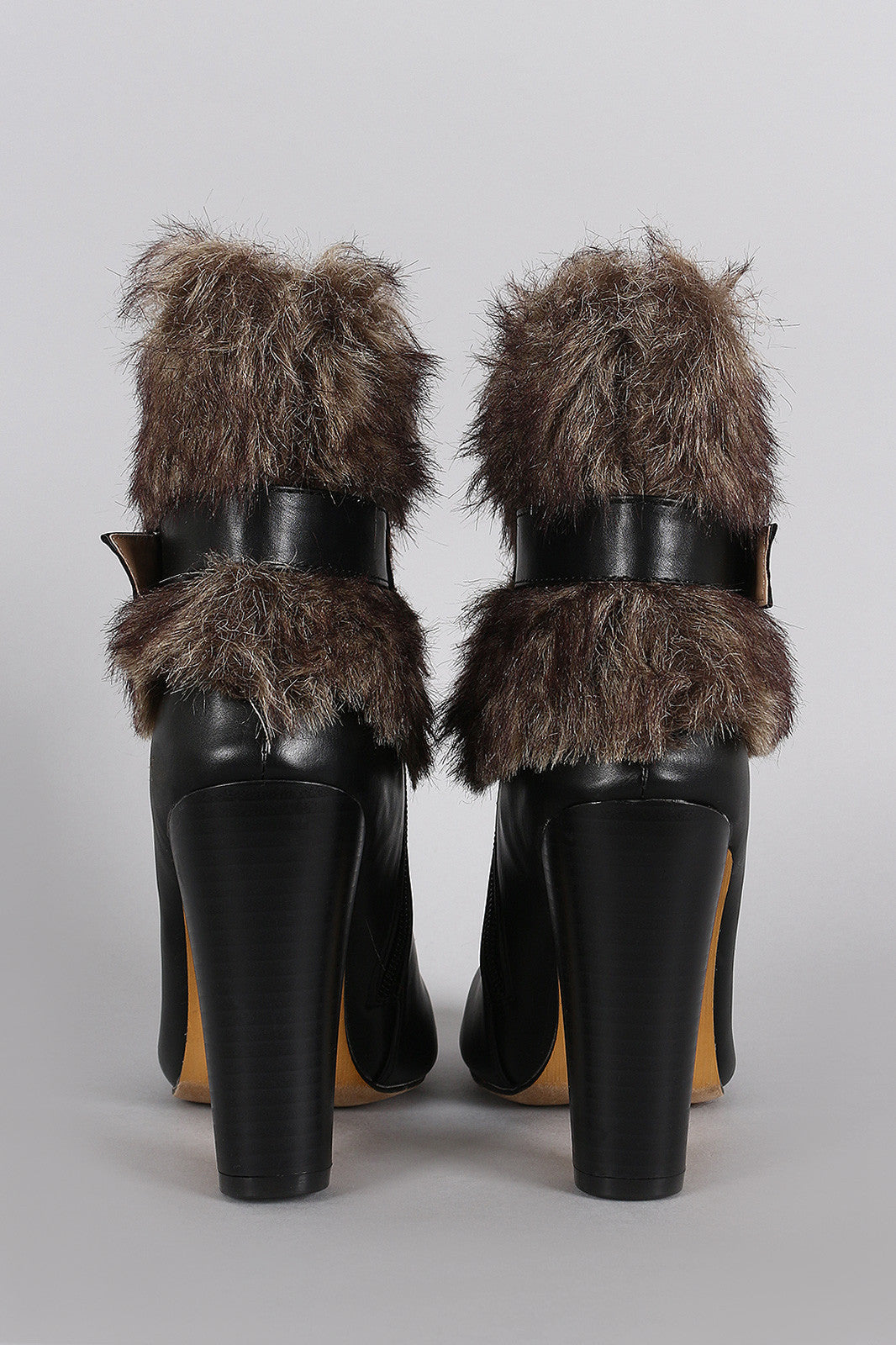 These booties have an almond toe silhouette, featuring faux fur with a buckle on top and a stacked heel. Finished with a side zipper for easy on-off wear.