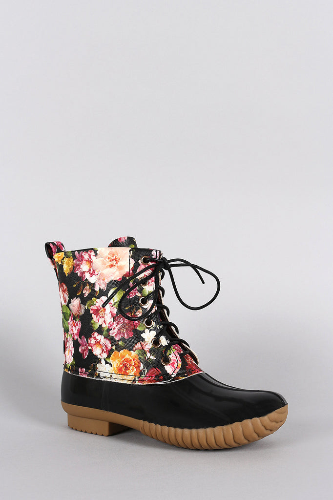 Low floral print and lace up front, a water resistant glossy PVC upper, and cozy plaid interior lining. Finished with a ridged round toe, flat heel, and pull tab at the back.