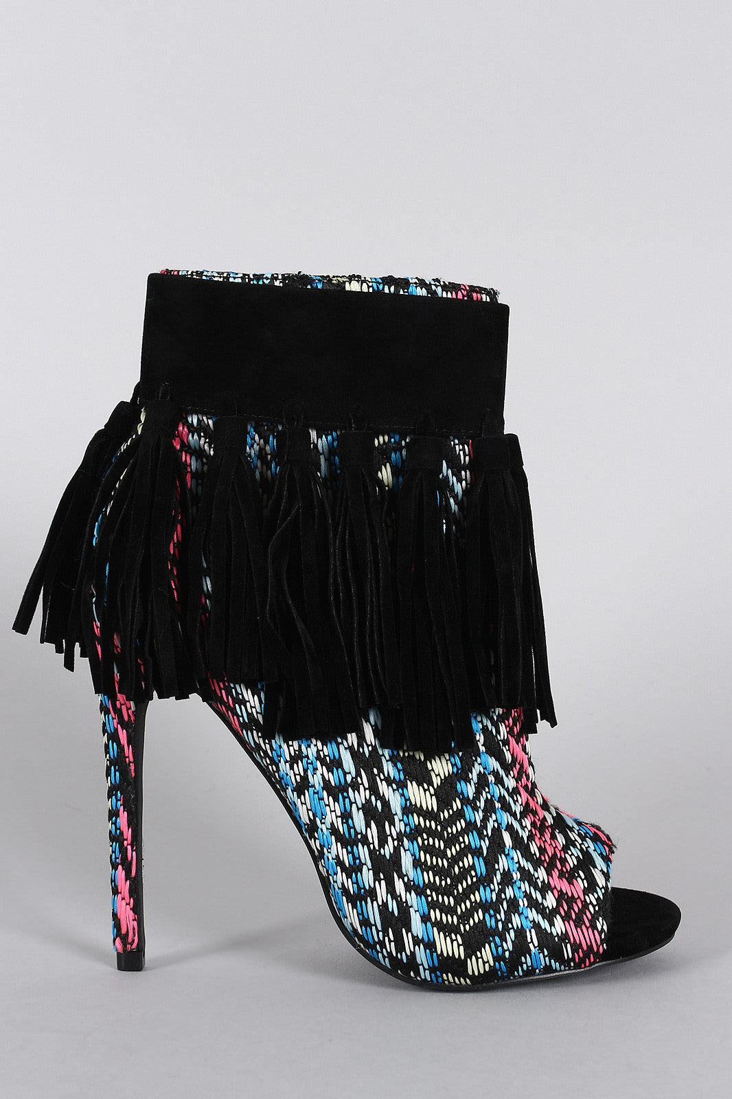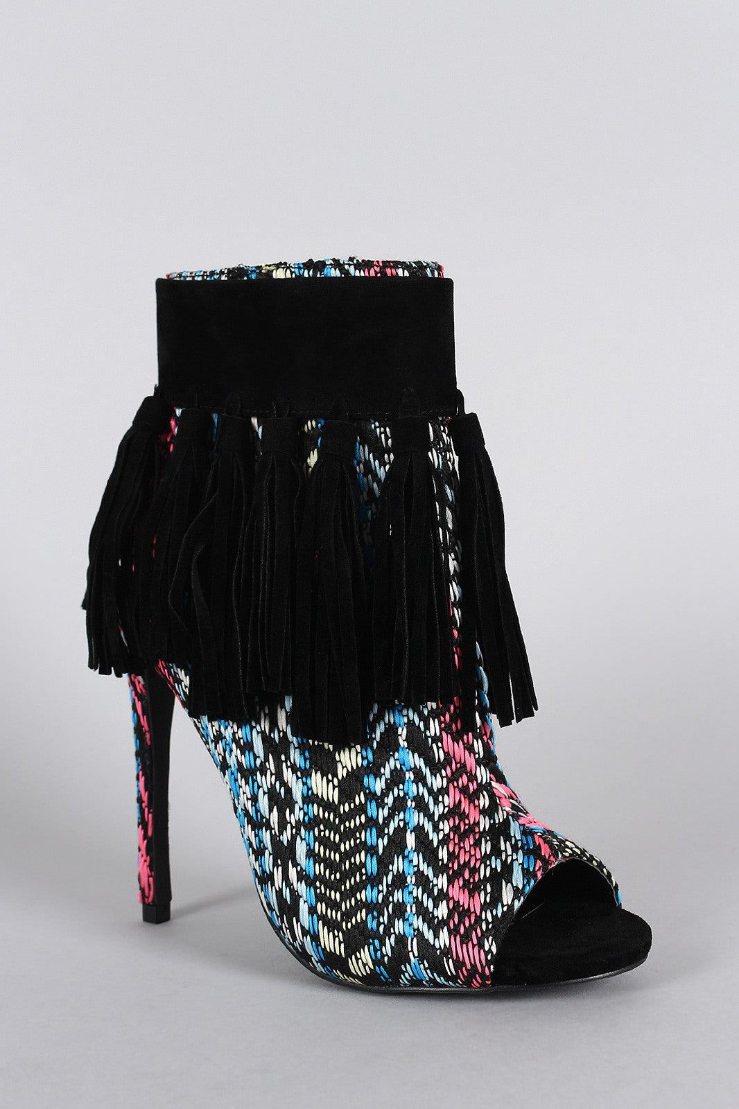 These stylishly chic ankle boots feature an open toe silhouette, colorful woven design upper with fringe tassel detailing, and wrapped stiletto heel. Finished with cushioned insole, smooth lining, and side zipper closure for easy on/off.
