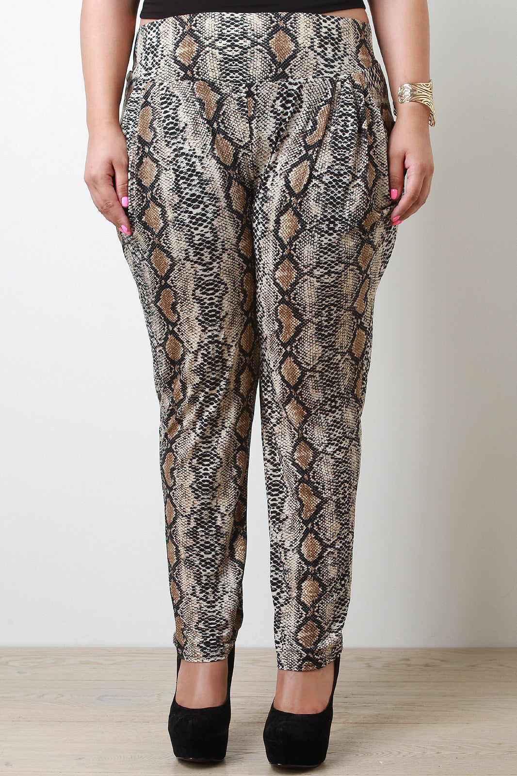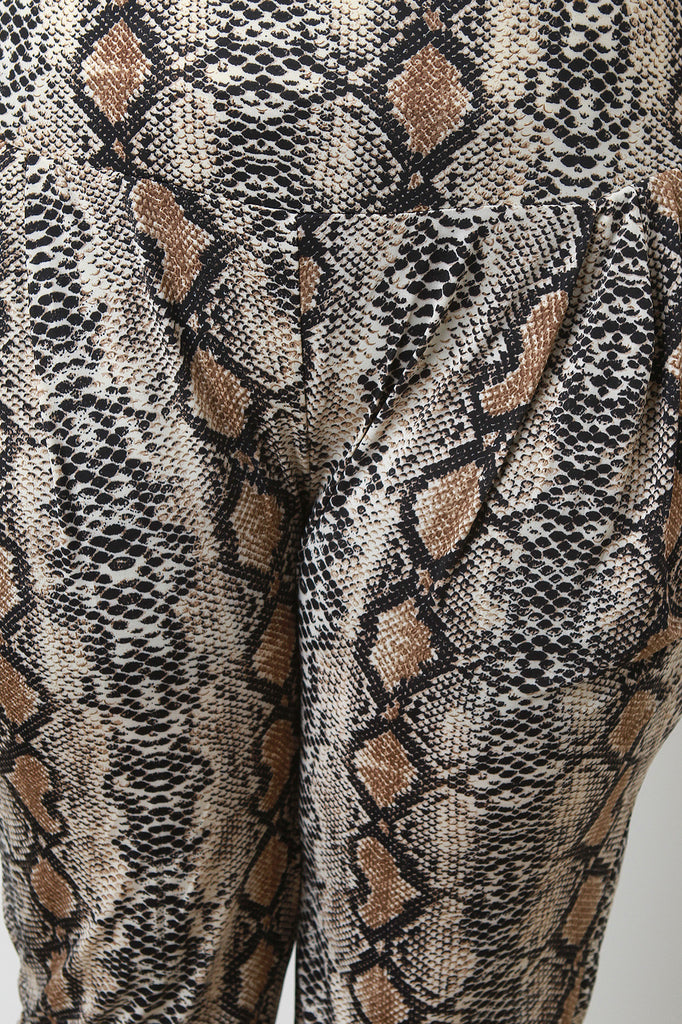 These   snake print  fabric for casual summer days. Features an elasticized waist band and side pockets. Finished with an ankle grazing cut. Accessories sold separately. 100% Polyester.