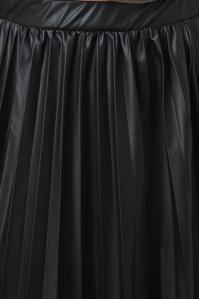 A plus size midi skirt featuring accordion-pleated faux leather and an elastic waist. Accessories sold separately. Made in U.S.A. 100% Rayon.