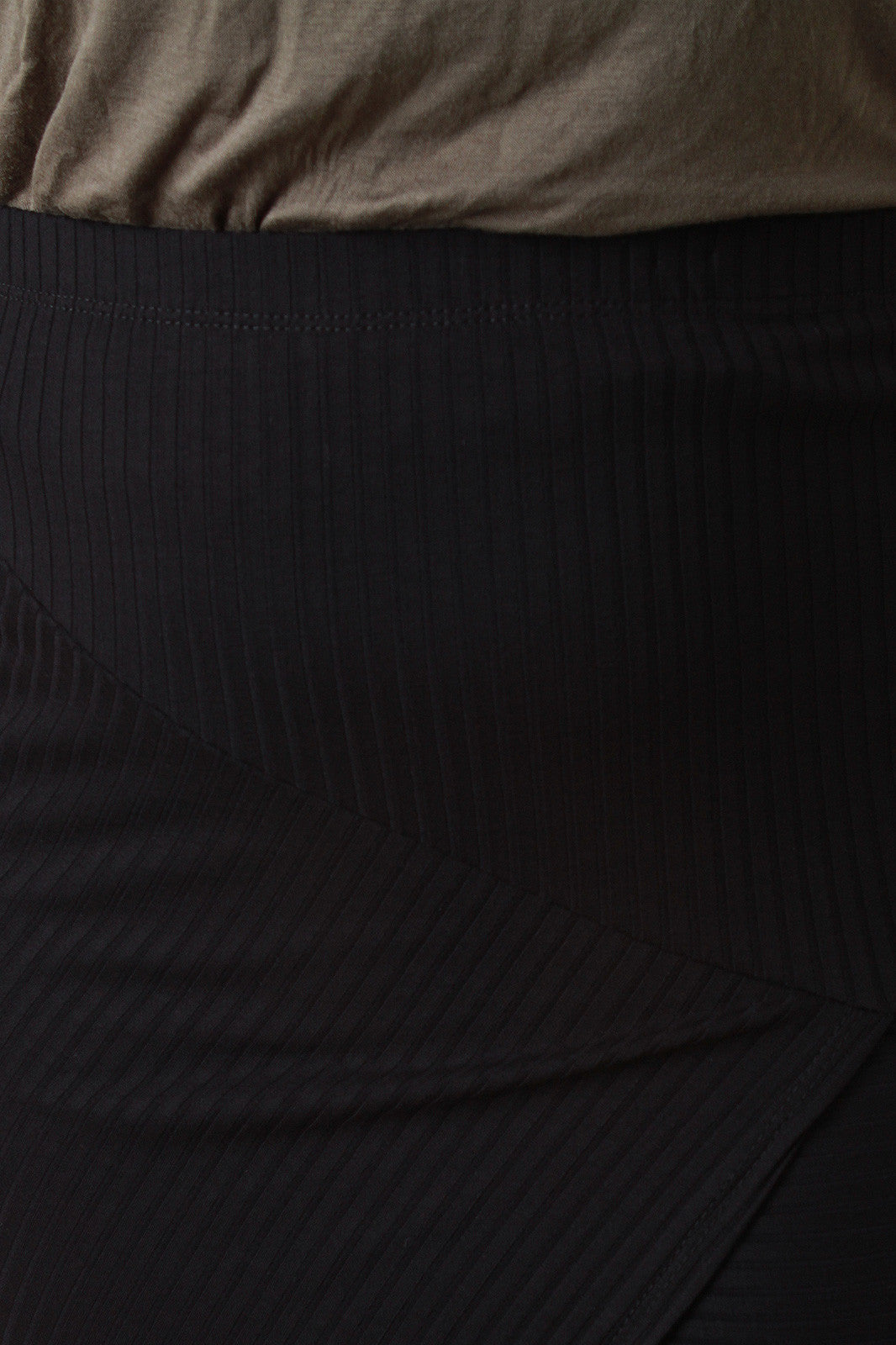 This plus size mini skirt features a stretchy knitted fabrication, elasticized waist, overlap design, and open side. Accessories sold separately. Made in U.S.A. 96% Rayon, 4% Spandex.
