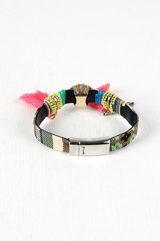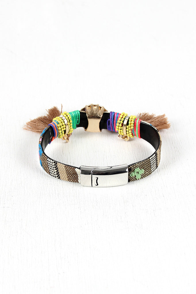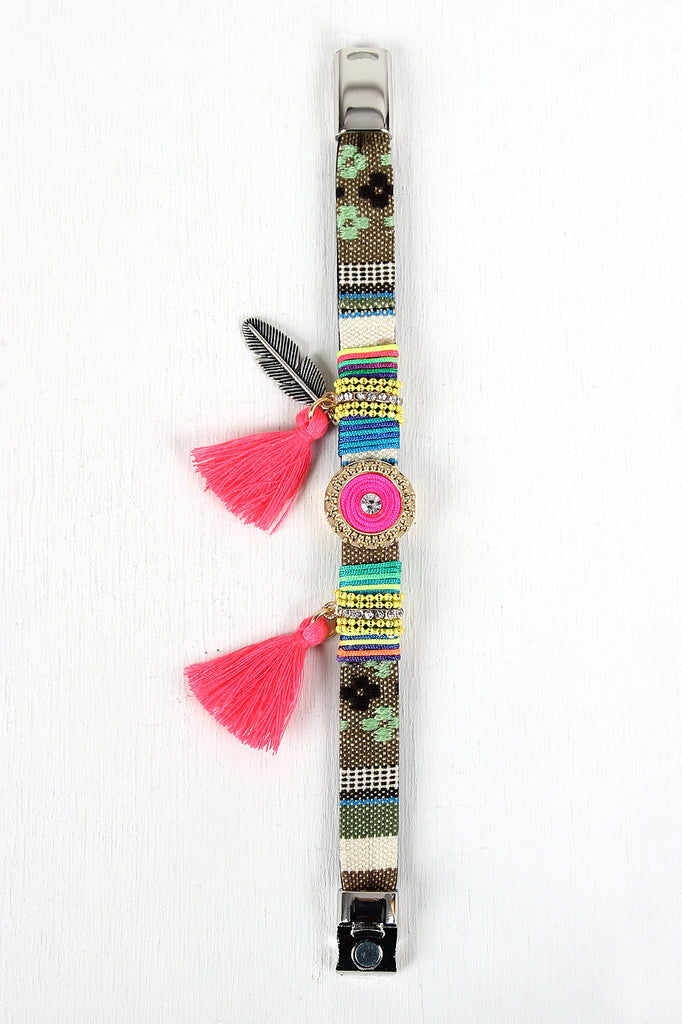 Embroidered fabric and leatherette bracelet with wrapped cord, chain, and rhinestone accents and circular centerpiece. Finished with tassel, leaf charm, and magnetic hook closure.