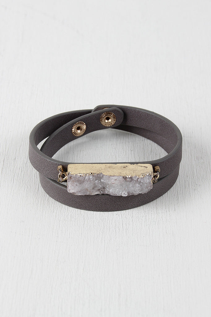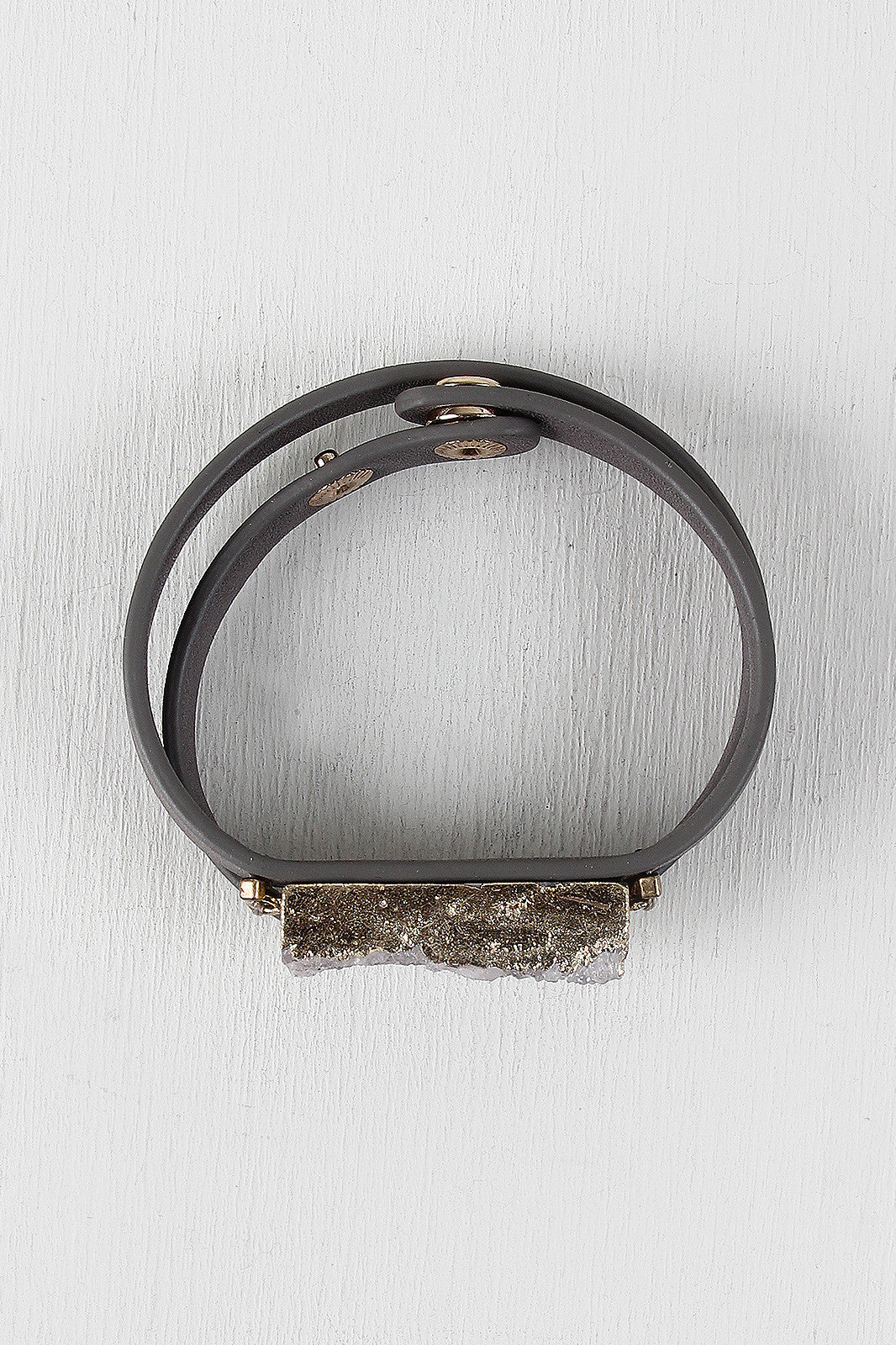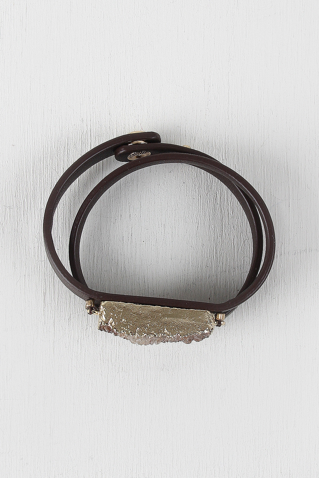 A wrap druzy stone bar centerpiece with gilded sides, and snap button closure that adjusts to two sizes.
