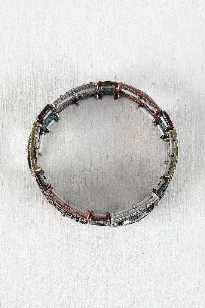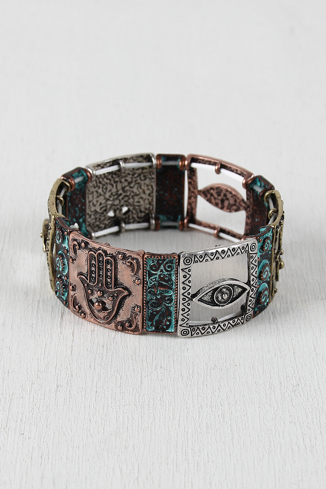 This elastic tile bracelet features different colors of hammered metallic plates with hamsa, eye, and swirling pattern reliefs.