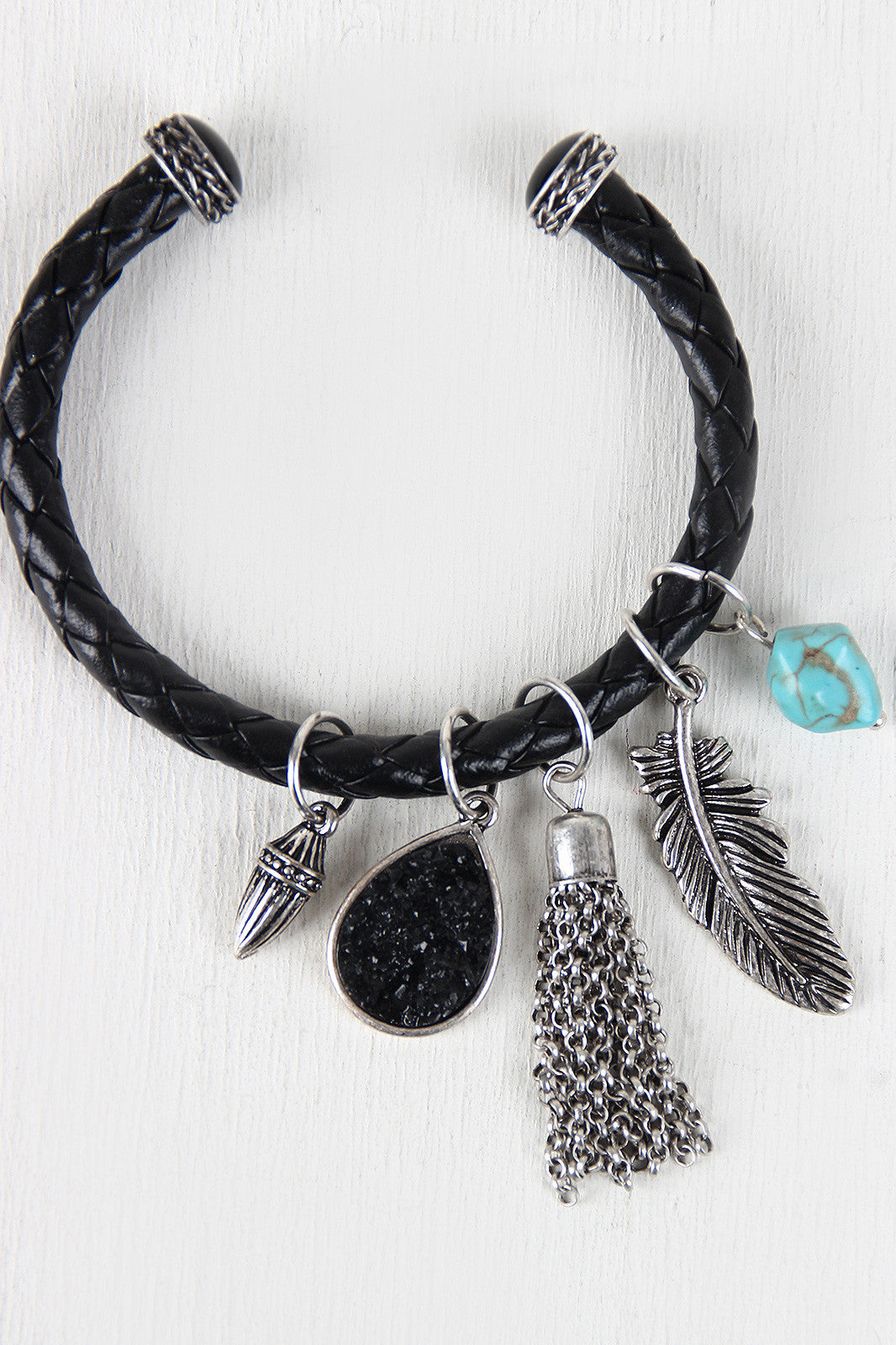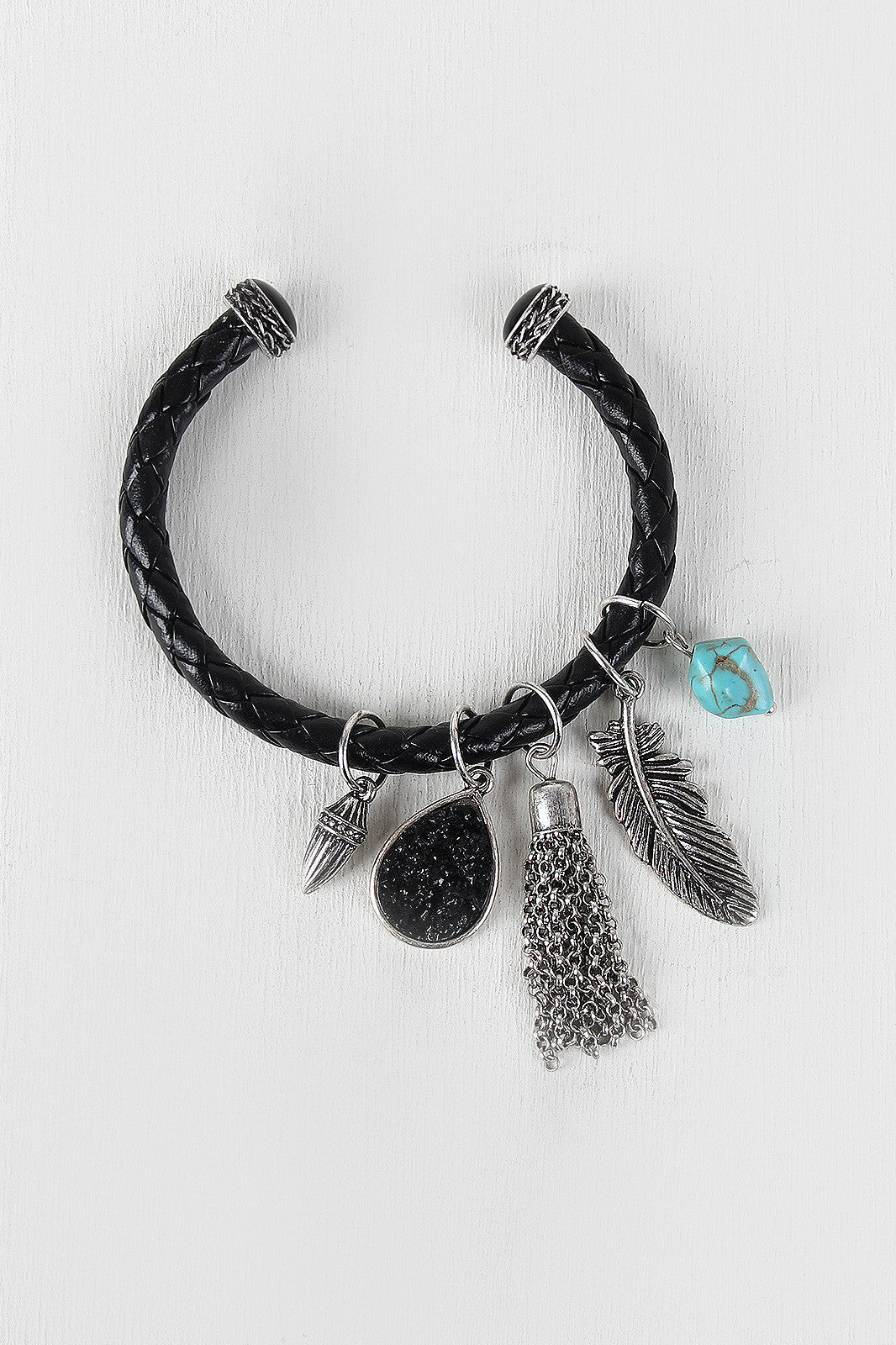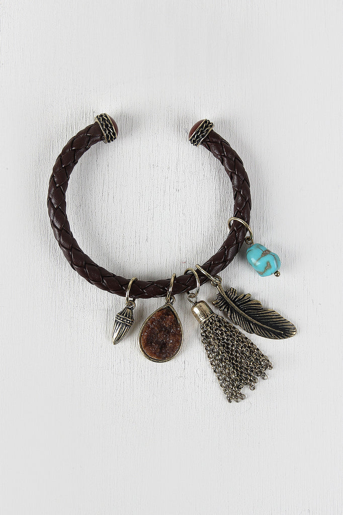 This bracelet features an open bangle with beads placed on the ends for decoration. It includes several pendants that are a decorative bullet, a gem, a chained tassel, feather, and a turquoise stone. Nickel and Lead and Cadmium Complaint.