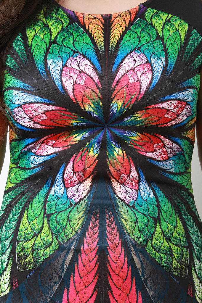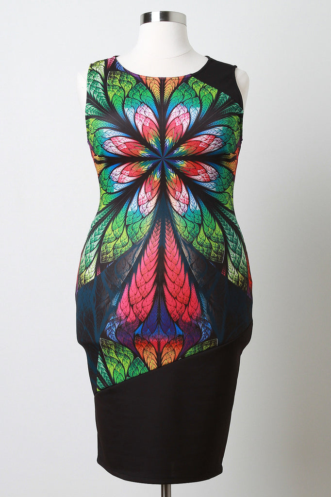 Bodycon plus size dress featuring a multicolor wheat print, paneled design, round neckline, and smooth stretchy fabric for sculpture fit. Accessories sold separately. Made in U.S.A. 95% Polyester, 5% Spandex.