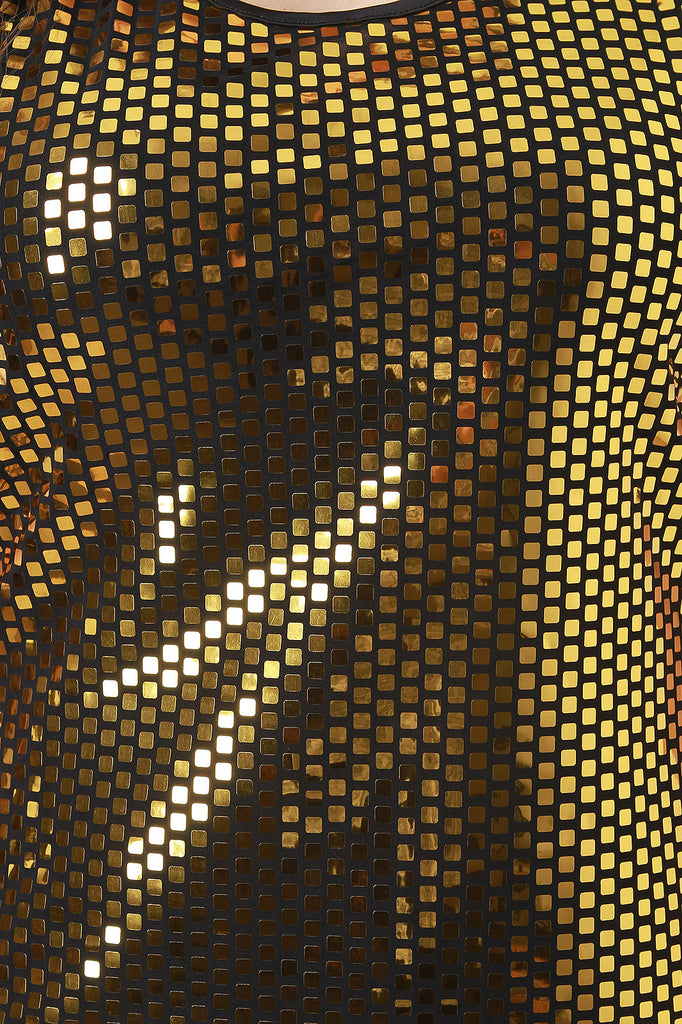 This plus size mini dress is retro inspired, featuring shiny gold metallic on a contrasting sheer black. It is sleeveless scoop neckline bodice with a curved hemline. Accessories sold separately. Made in U.S.A. Self: 100% Polyester. Contrast: 95% Polyester, 5% Spandex.