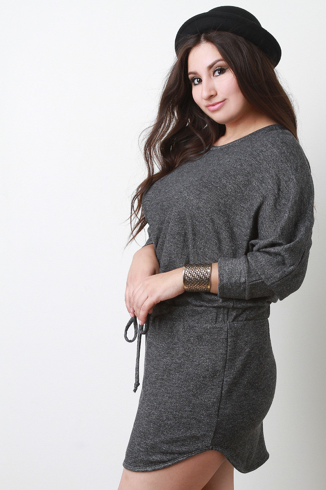 This plus size dress features soft french terry fabric, round neckline, long sleeves, self-tie drawstring at waist, open back, and finished with curved hem. Accessories sold separately. 46% Polyester, 30% Rayon, 24% Cotton.