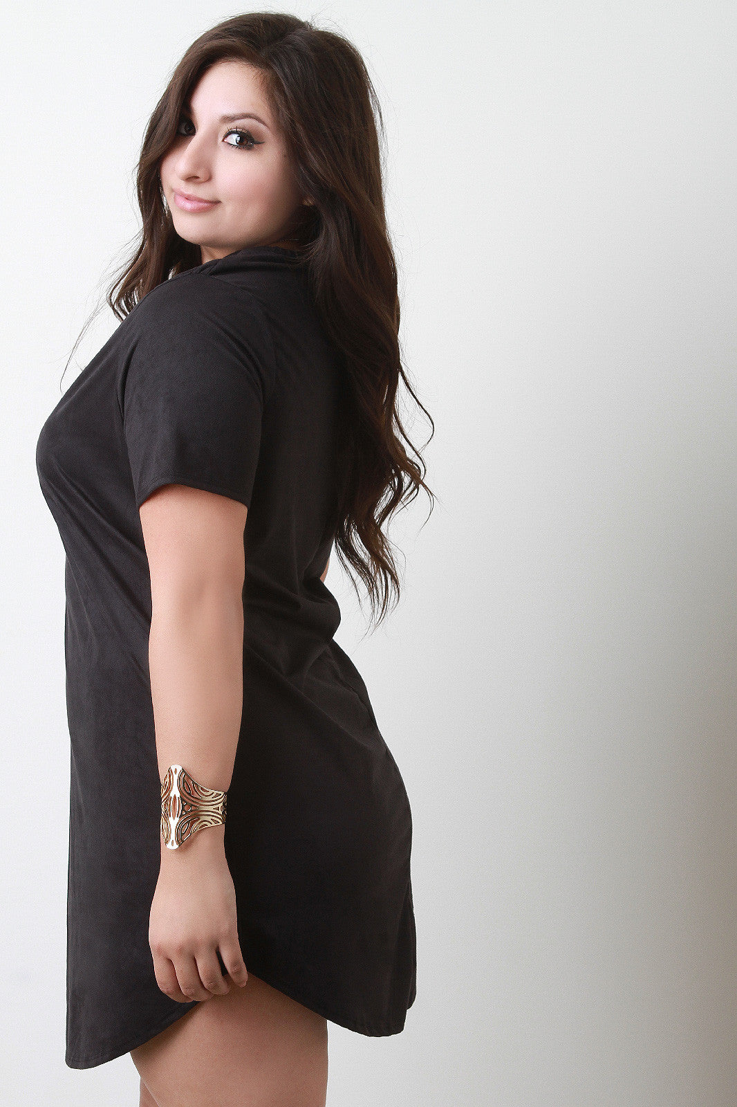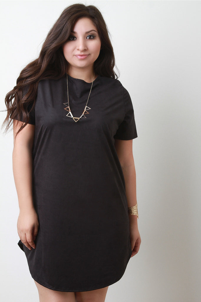 A plus size t-shirt dress featuring faux suede, a round neckline, and short sleeves. Finished with a curved hemline. Accessories sold separately. Made in U.S.A. 90% Polyester, 10% Spandex.