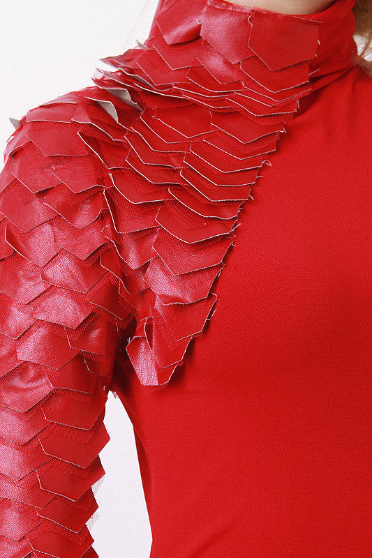 Featuring a slight turtle neckline, full length sleeves, leatherette and semi sheer mesh cutout detail, scrunched sides, and back zipper closure. Accessories sold separately. 95% Polyester, 5% Elastane.