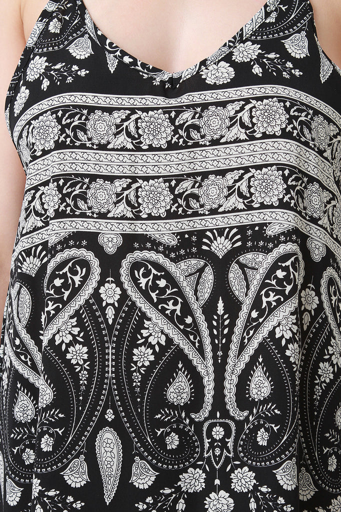 This dress features a relax cut fit, floral and paisley pattern print, sleeveless, v-neckline, racer back, and spaghetti shoulder straps. Accessories sold separately. Made in U.S.A. 100% Polyester.