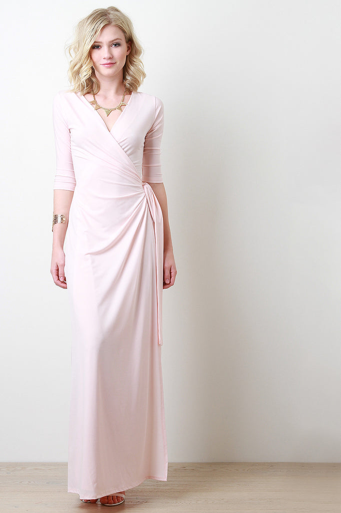 This sleek dress features a surplice neckline, quarter-length sleeves, wrap style construction with a self-tie sash at waist, and maxi length hemline. Accessories sold separately. Made in U.S.A. 95% Polyester, 5% Spandex.