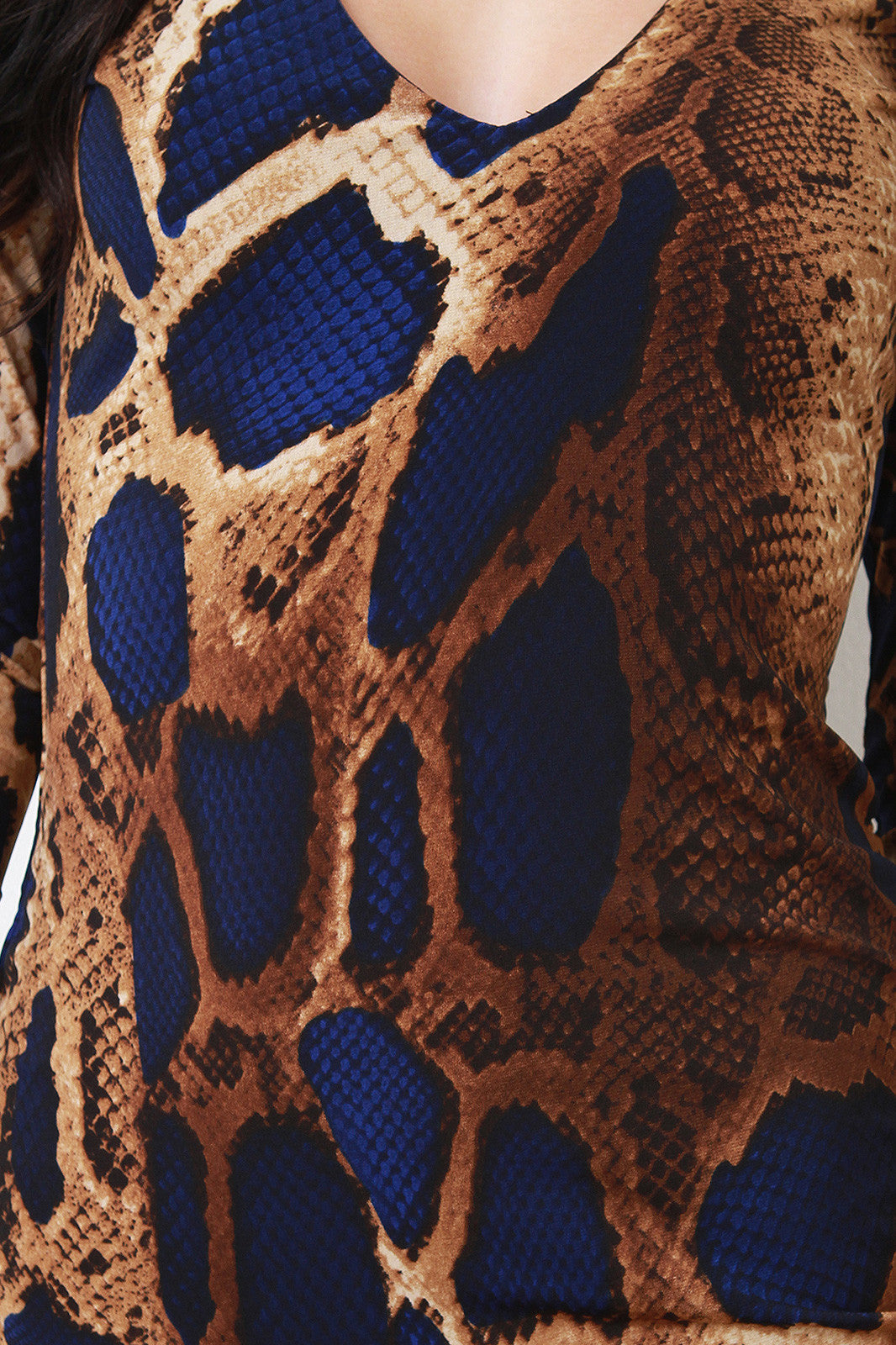 This sexy snake print , deep v-neckline, midi length, and side slit. Accessories sold separately. Made in U.S.A. 95% Polyester, 5% Spandex.