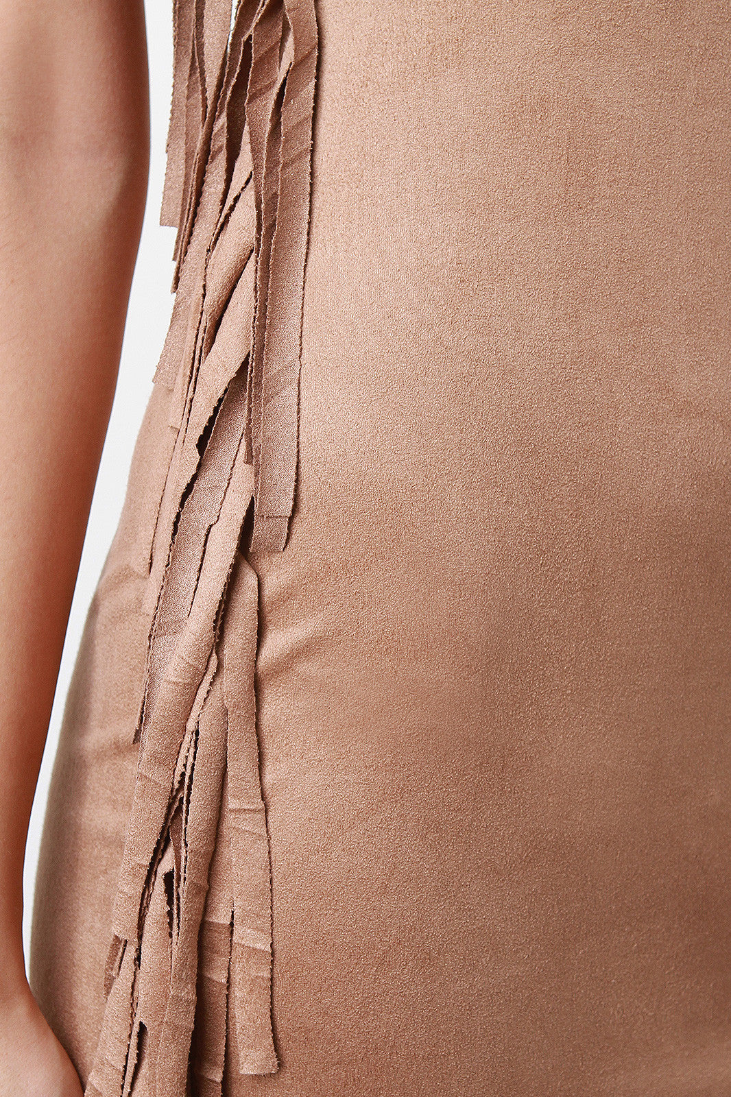 This bodycon dress features a round neckline, sleeveless design, vegan suede fabrication, stretchy sculpture fit, and cascading fringes along sides. Accessories sold separately. Made in U.S.A. 92% Polyester, 8% Spandex.
