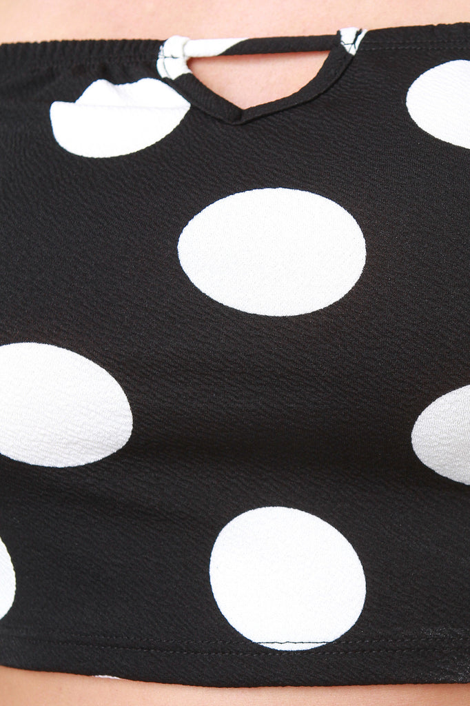 This crop top features an elasticized off-the-shoulder neckline, quarter-length sleeves, keyhole yoke, and large contrasting polka-dot print on texture knit fabrication. Accessories sold separately. Made in U.S.A. 92% Polyester, 8% Spandex.