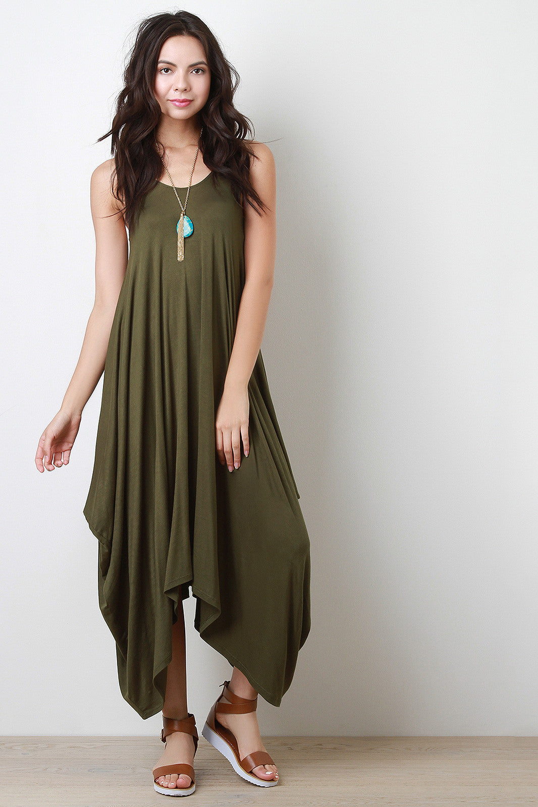 A sleeveless maxi dress with round neckline, draping sides, and handkerchief hemline. Unlined. Accessories sold separately. Made in U.S.A. 95% Rayon, 5% Spandex.