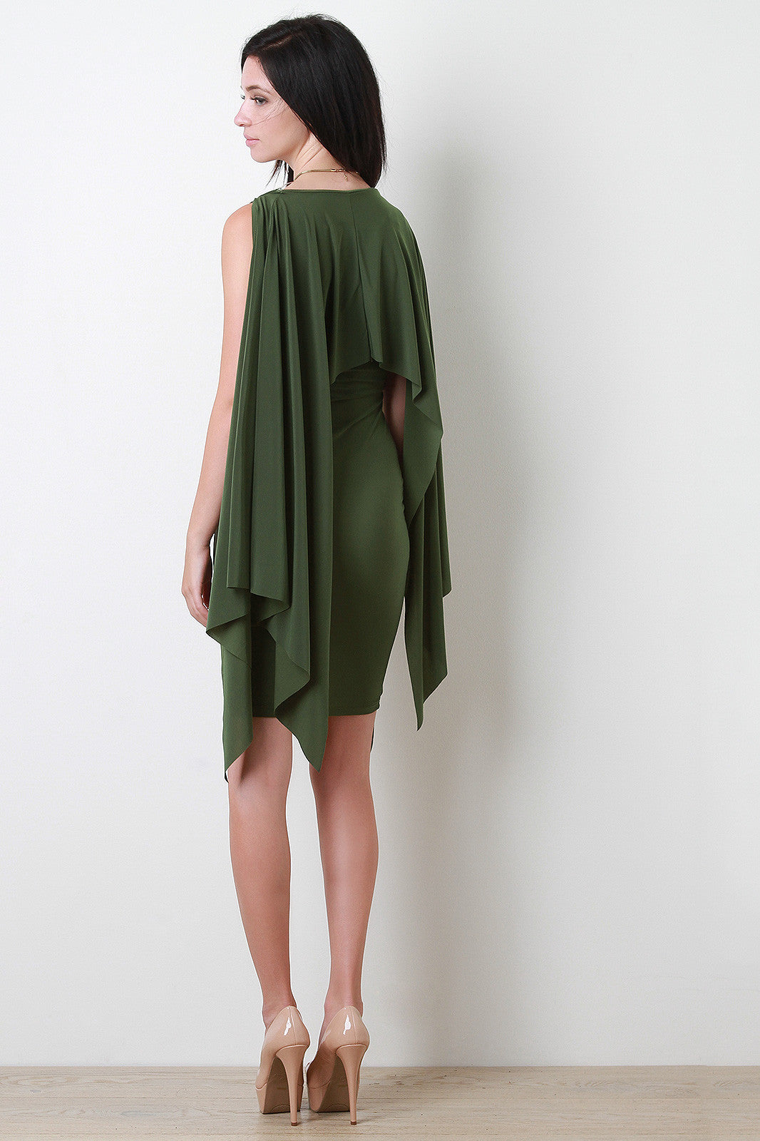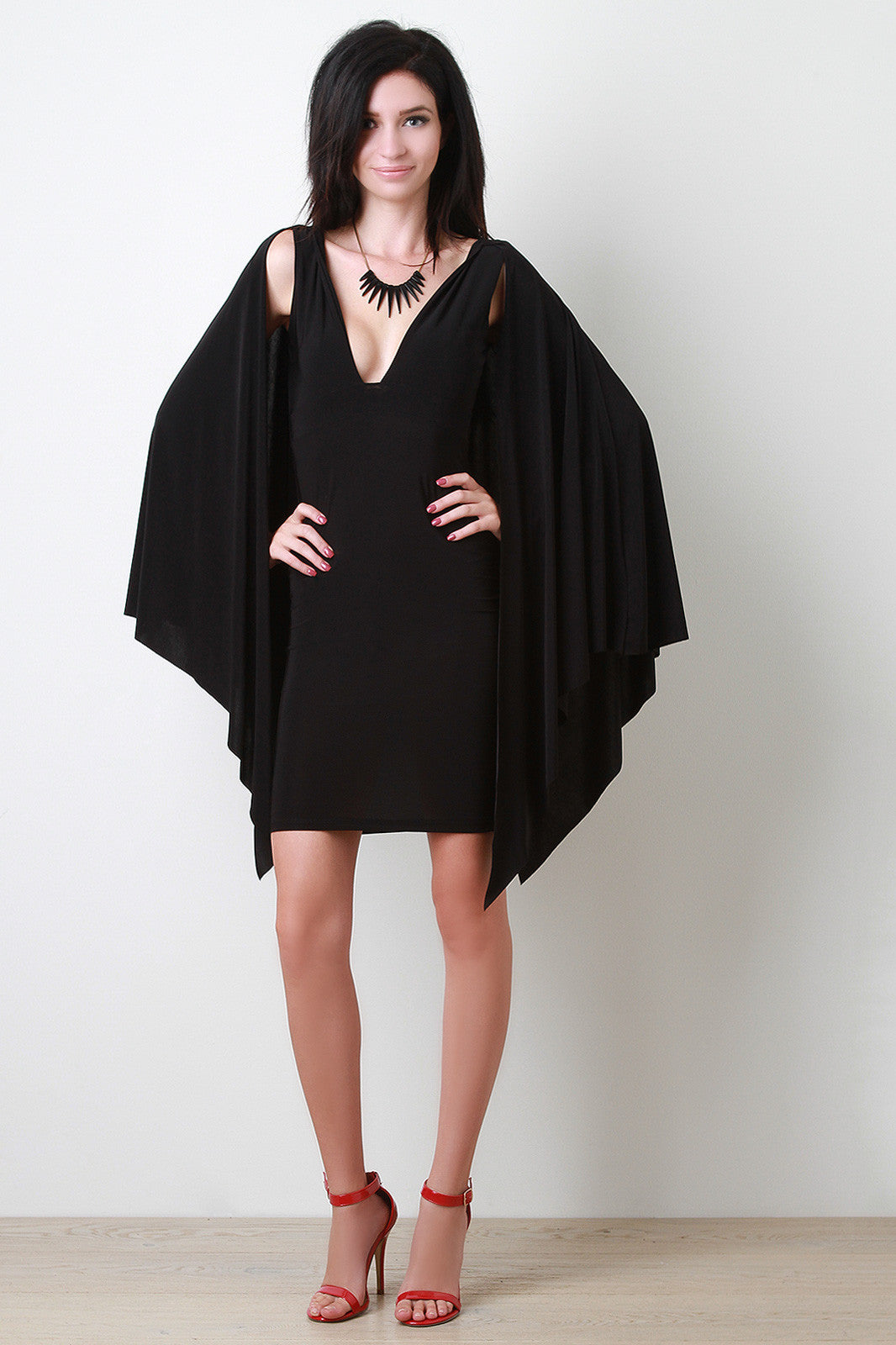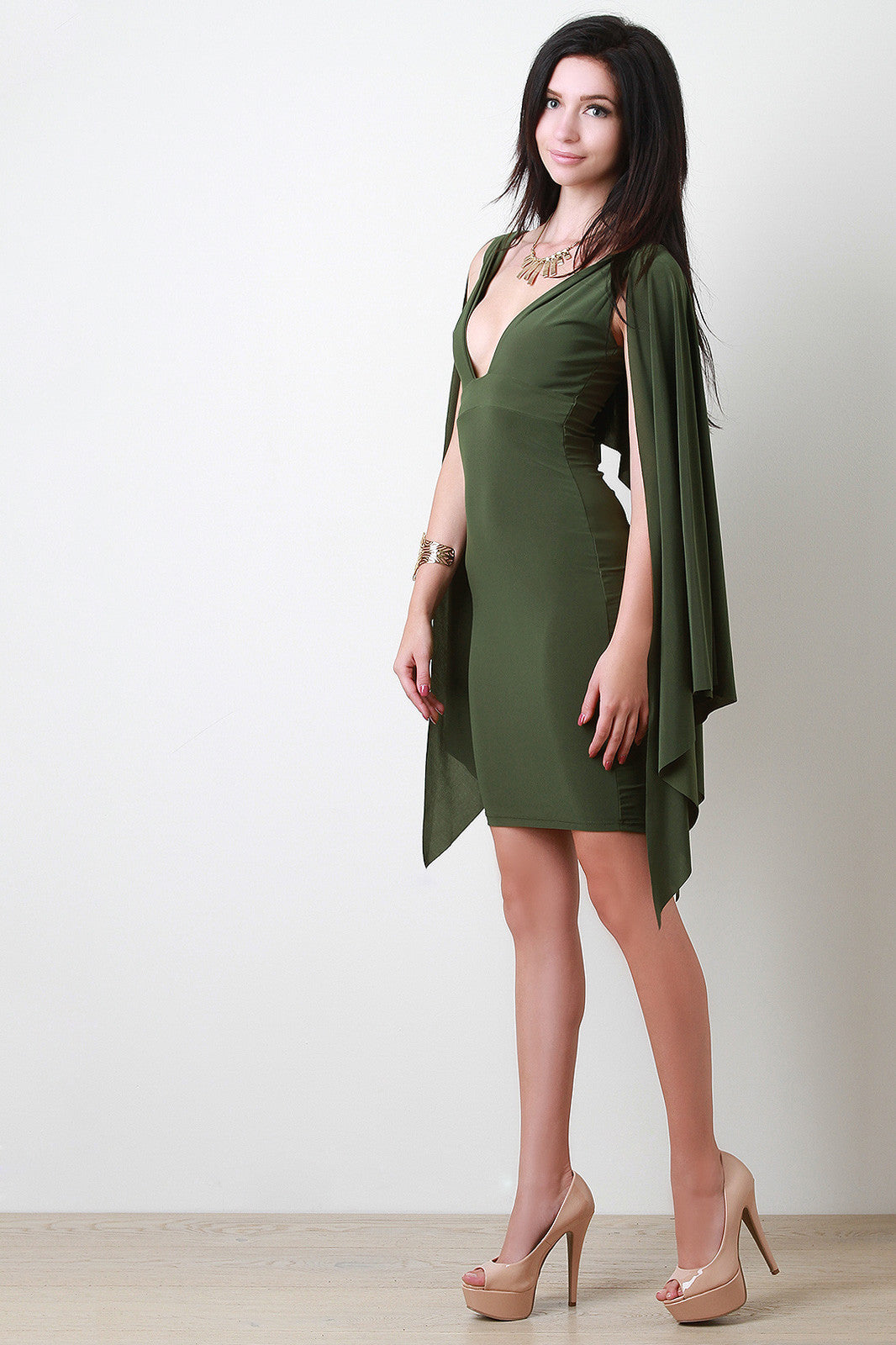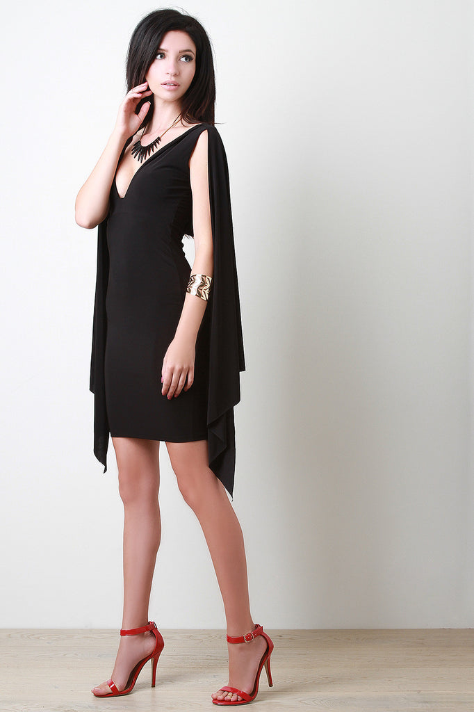 An elegant bodycon dress featuring a plunging square neckline and draping shawl-like cape sleeves. Accessories sold separately. Made in U.S.A. 96% Polyester, 4% Spandex.