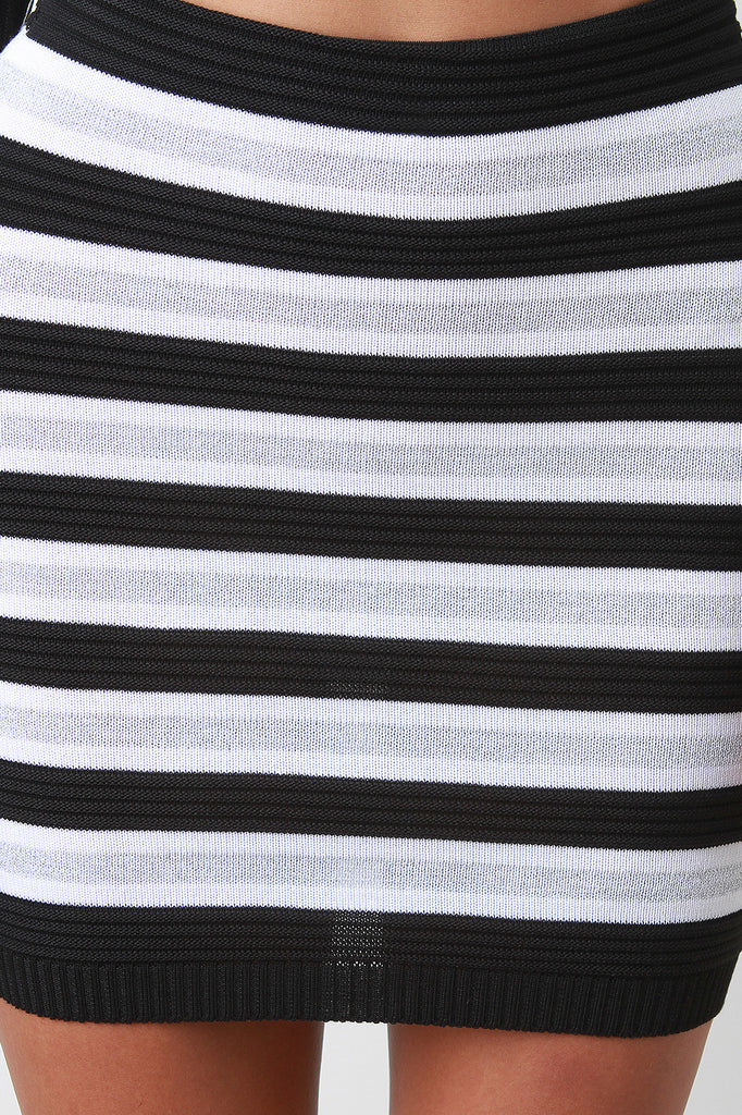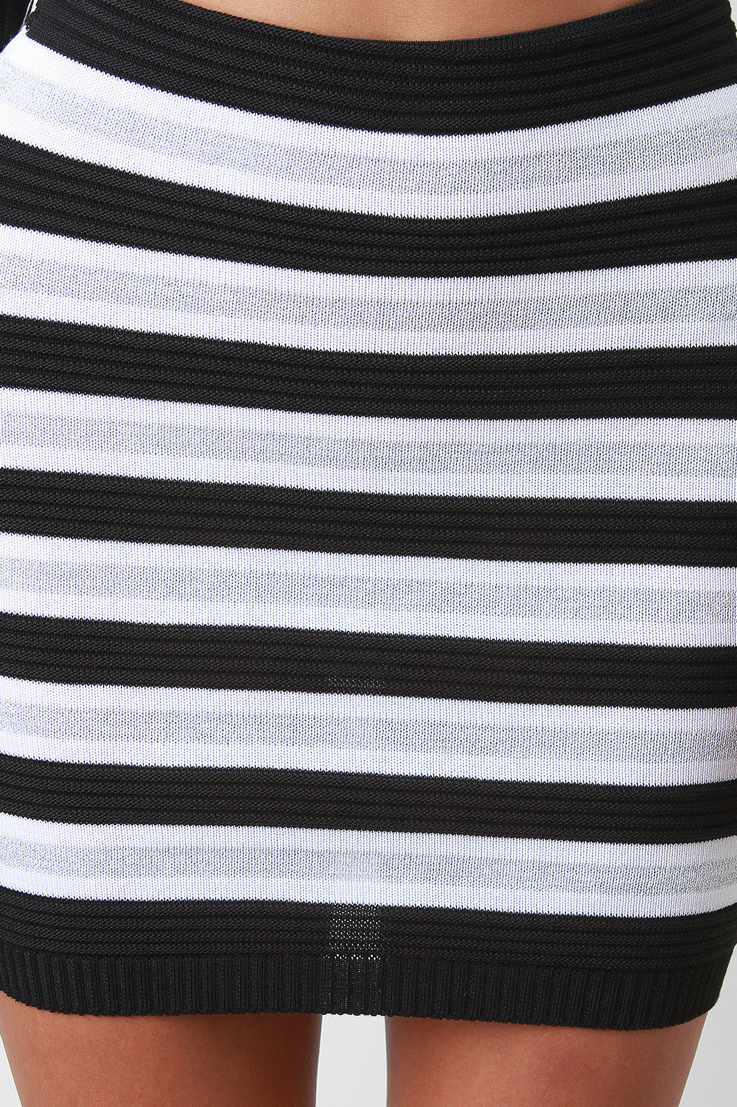 This mini skirt features soft knit, horizontal stripe design with shimmer accent, elasticized waist, and rib knit hemline. Accessories sold separately. Made in U.S.A. 92% Acrylic, 6% Elastic, 2% Metallic.