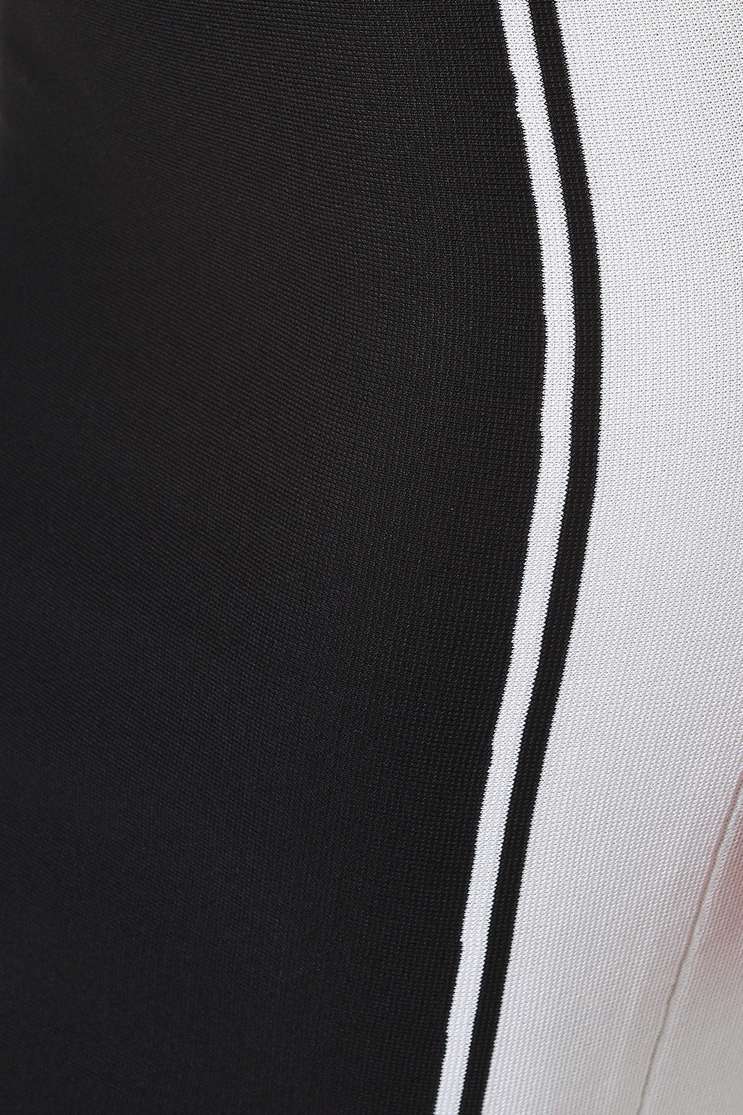 This knitted midi skirt features an elasticized waist, stretchy sculpture fit, and contrasting color block sides. Accessories sold separately. Made in U.S.A. 65% Rayon, 35% Nylon.
