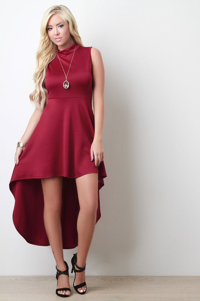 This sleeveless dress features smooth fabric with a slight sheen, a mock neckline, and a high-low hemline. Accessories sold separately. Made in U.S.A. 96% Polyester, 4% Spandex.