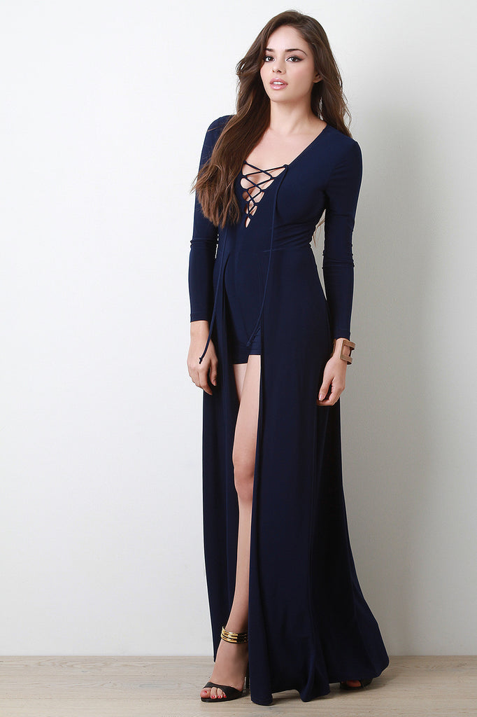 A maxi romper featuring a corset lace up v-neckline, long sleeves, and long side tiers with shorts layer underneath. Accessories sold separately. Made in U.S.A. 95% Polyester, 5% Spandex.
