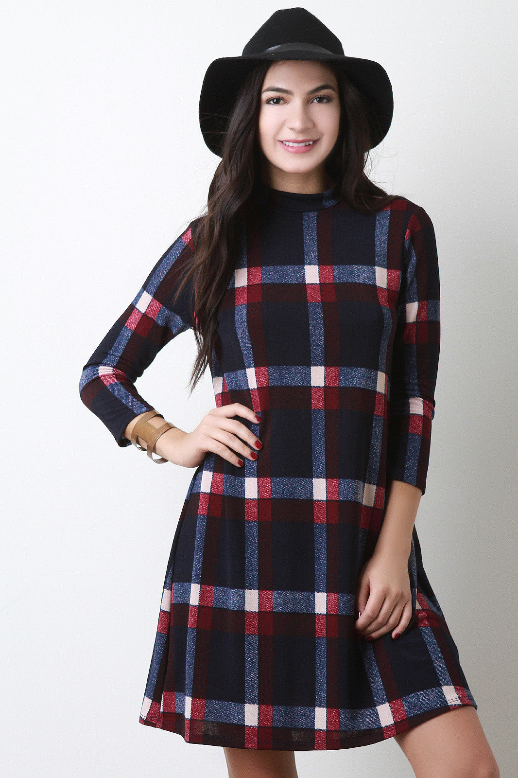 Plaid Mock Neck Shift Dress