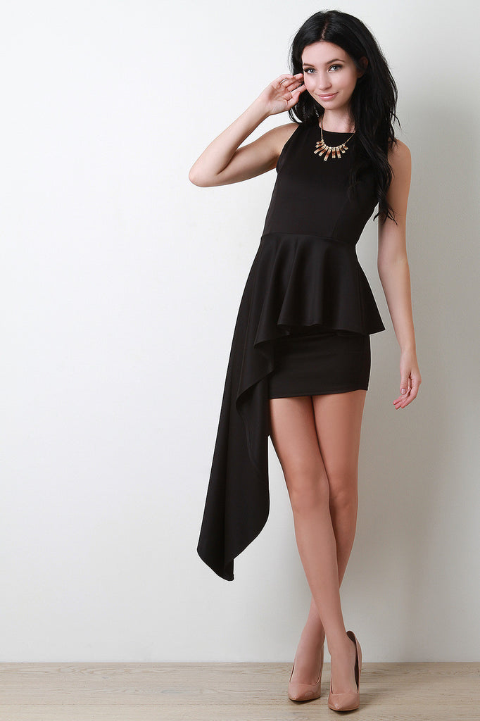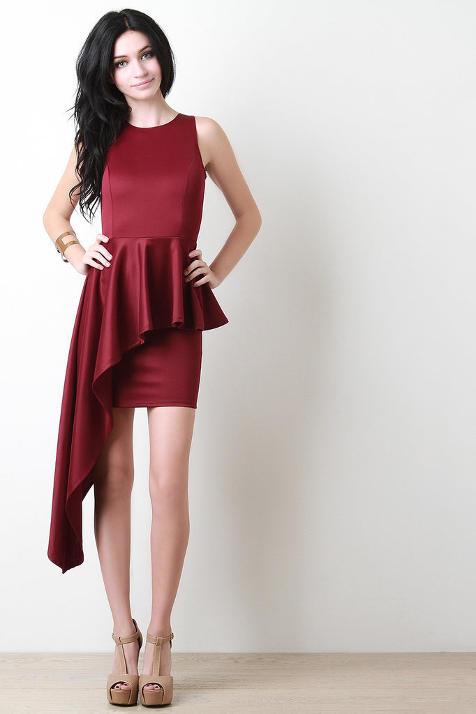 A sleeveless dress featuring a smooth glossy fabric, high round neckline, and flattering princess seams on the bodice. Finished with a draping asymmetrical peplum and back zipper closure. Accessories sold separately. Made in U.S.A. 96% Polyester, 4% Spandex.