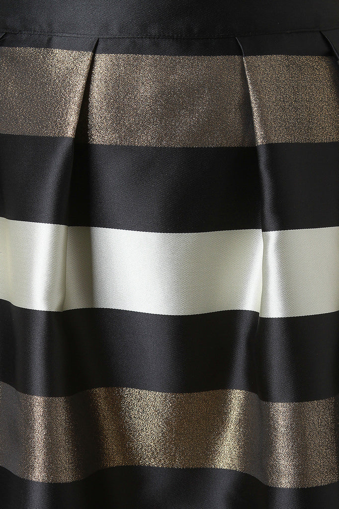 This midi skirt features smooth fabric, horizontal stripes with metallic accents, pleated design, and a-line cut. Finished with lining. Accessories sold separately. Shell: 100% Polyester. Lining: 100% Polyester.