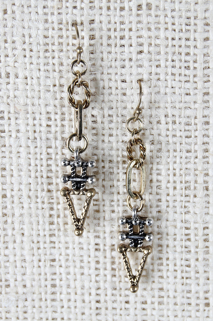 Mixed metals earrings featuring sections of twisted and mechanical shapes ending in a point. Finished with French hook backs.
