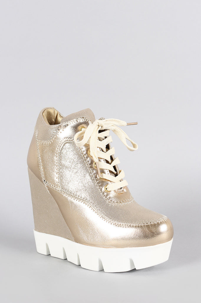 This high top wedge sneaker features a round toe, combination of metallic leatherette/fabric upper, and lug sole platform wedge heel. Finished with padded collar/tongue, cushioned insole, and lace up closure.Material: Metallic Leatherette/Fabric (man-made)Sole: Treaded