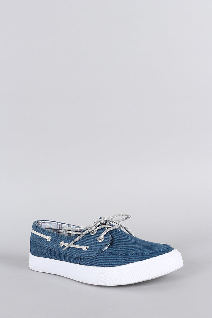 This boat flat features a round toe, denim upper, and contrasting lacing detail. Finished with cushioned insole and plaid fabric interior lining.Material: Denim (man-made)Sole: Rubber